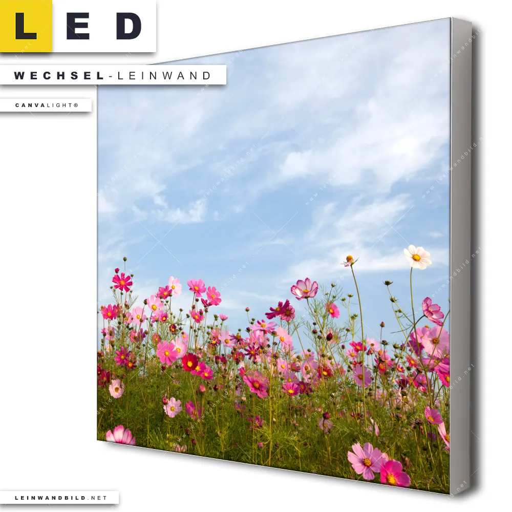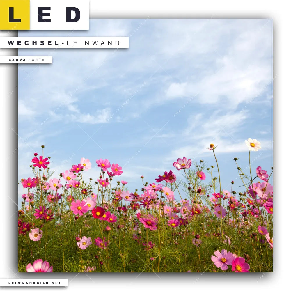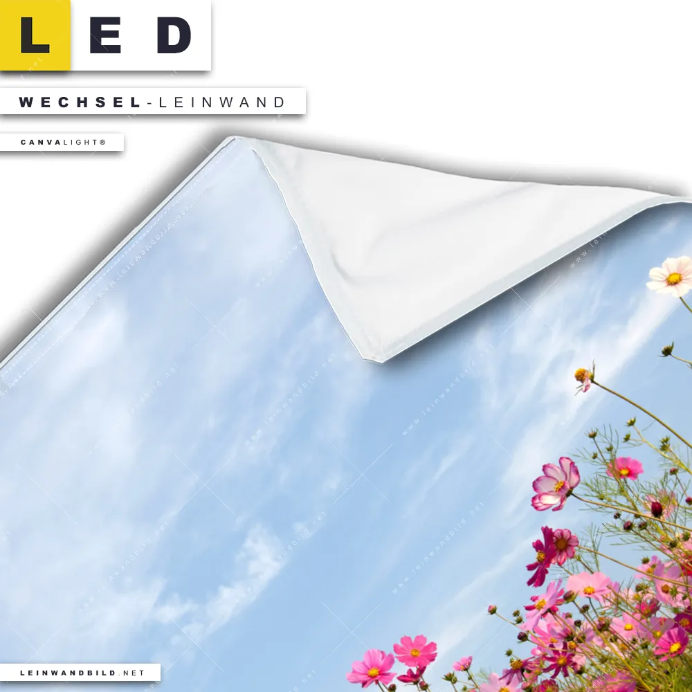 LED Wechsel-Leinwand Canvalight® TEX | Blumenwiese bei strahlend blauem Himmel | Quadrat