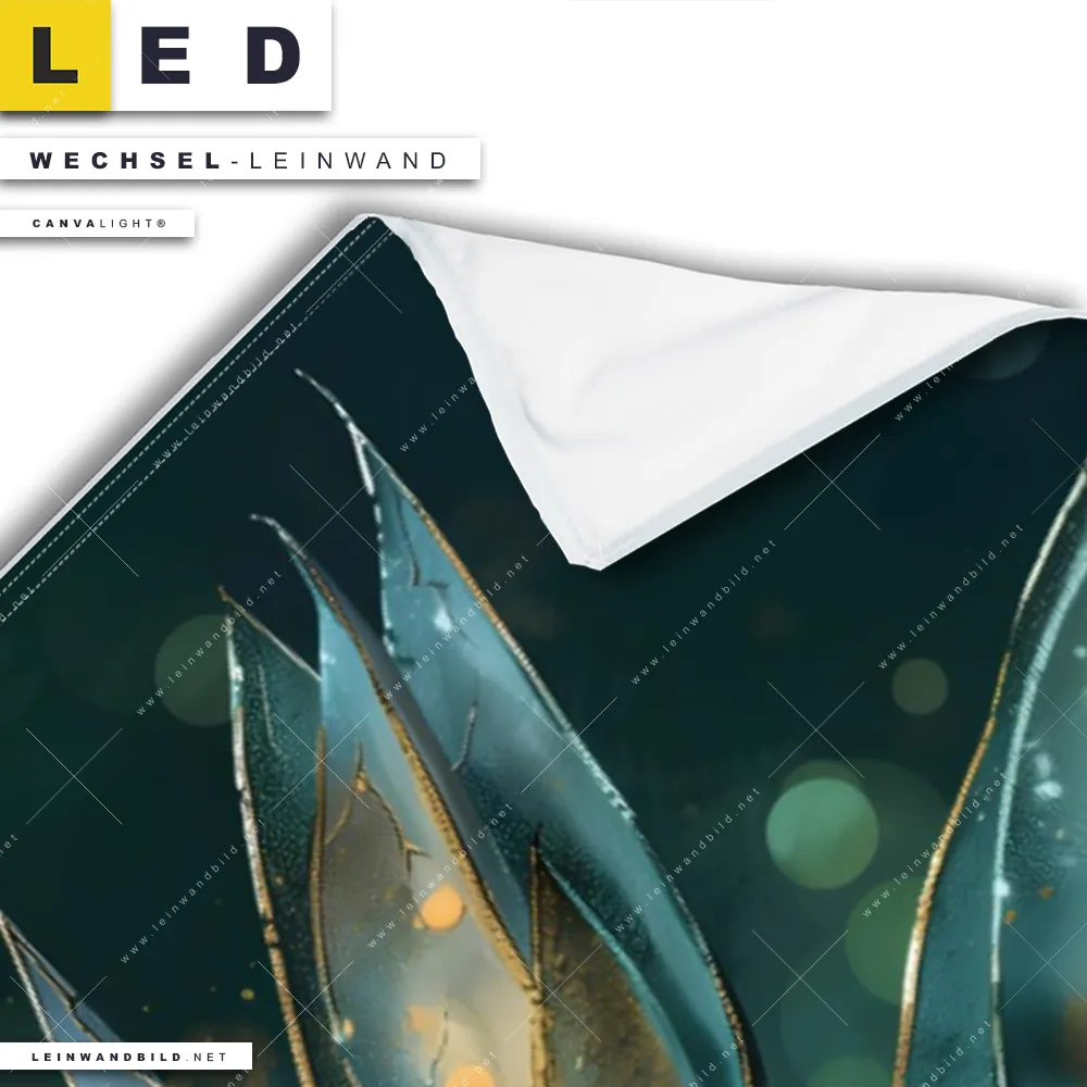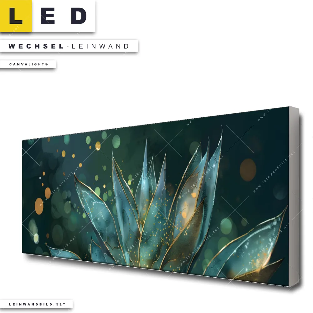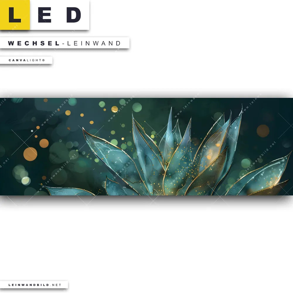 Du bist auf der Suche nach einer Blumen - Botanik Wechsel-Leinwand für Dein LED-Leinwandbild im Panorama-Format? Begriffe wie Blumen, Sukkulente, Kaktus, Pflanze, Natur, Blüten, Glitzer haben Dich auf der Suche nach Deiner Ersatz-Leinwand für dein extra breites LED Wandbild mit wechselbarer Leinwand inspiriert? Farben wie Grün, Gold, Türkis dürfen auf Deinem neuen Wechselmotiv für Dein XXL Leinwand-LED-Bild nicht fehlen und Leinwände im Floral, Abstrakt, Modern Art Stil für Leuchtbilder passen perfekt zu Deinem Einrichtungsstil?