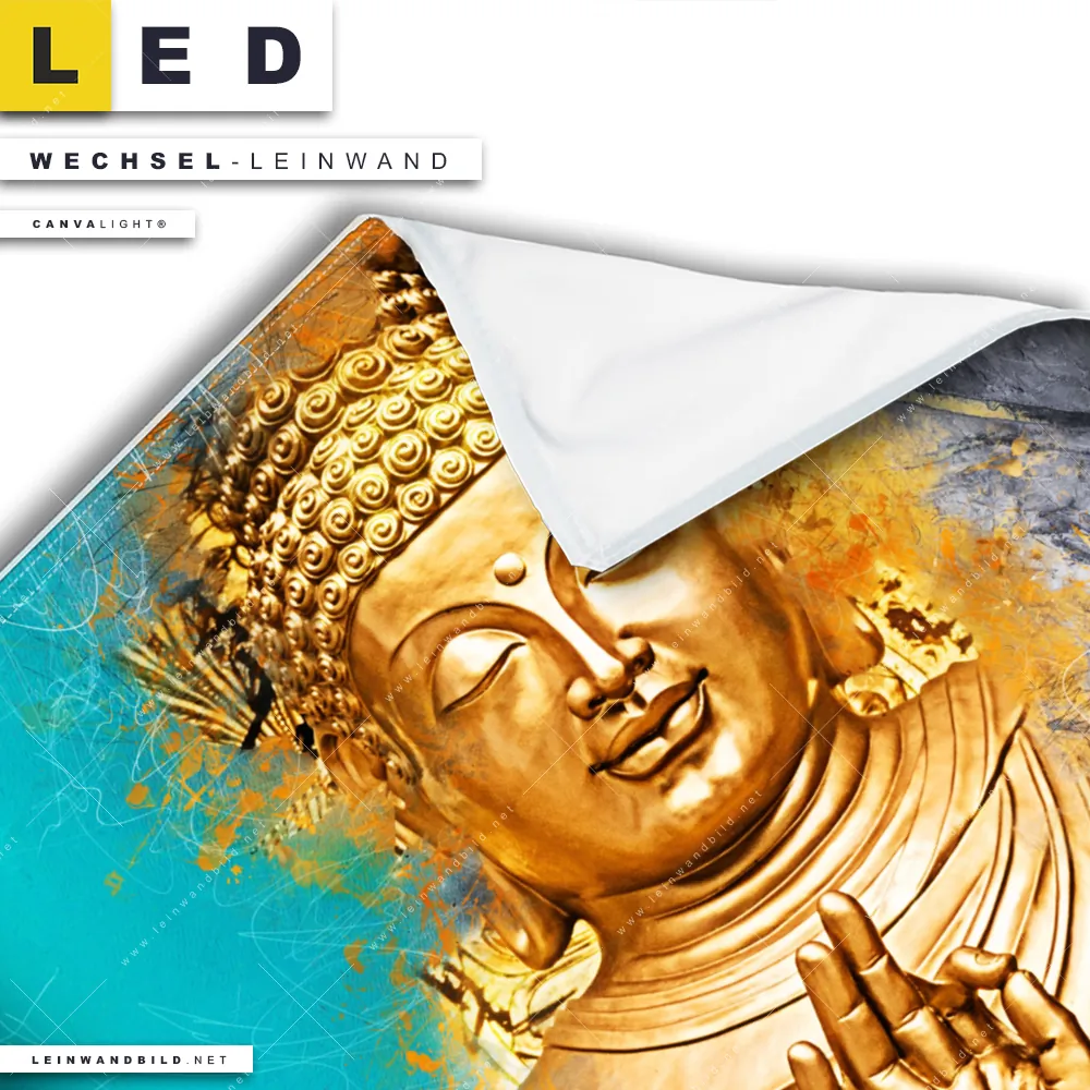 Du konfigurierst Deine individuelle LED Wechsel-Leinwand Canvalight® TEX | Buddha Gold & Türkis | Quadrat und wir produzieren sie NEU für Dich. Unsere Buddha - Feng Shui Austausch-Fotoleinwände für Canvalight® LED Bilder sind KEINE Lagerware. Du bist Dir unsicher, welches Motiv oder Format das richtige für dein individuelles LED Wechselmotiv auf Leinwand ist, dann helfen wir dir gerne weiter und beraten dich!