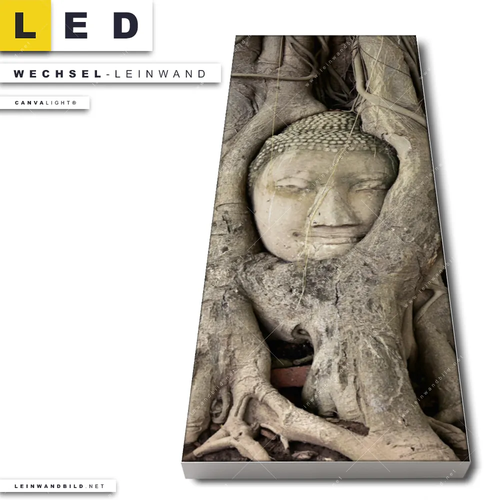 Du konfigurierst Deine individuelle LED Wechsel-Leinwand Canvalight® TEX | Buddha in Baumwurzeln | Schmal und wir produzieren sie NEU für Dich. Unsere Buddha - Feng Shui Austausch-Fotoleinwände für Canvalight® LED Bilder sind KEINE Lagerware. Du bist Dir unsicher, welches Motiv oder Format das richtige für dein individuelles LED Wechselmotiv auf Leinwand ist, dann helfen wir dir gerne weiter und beraten dich!