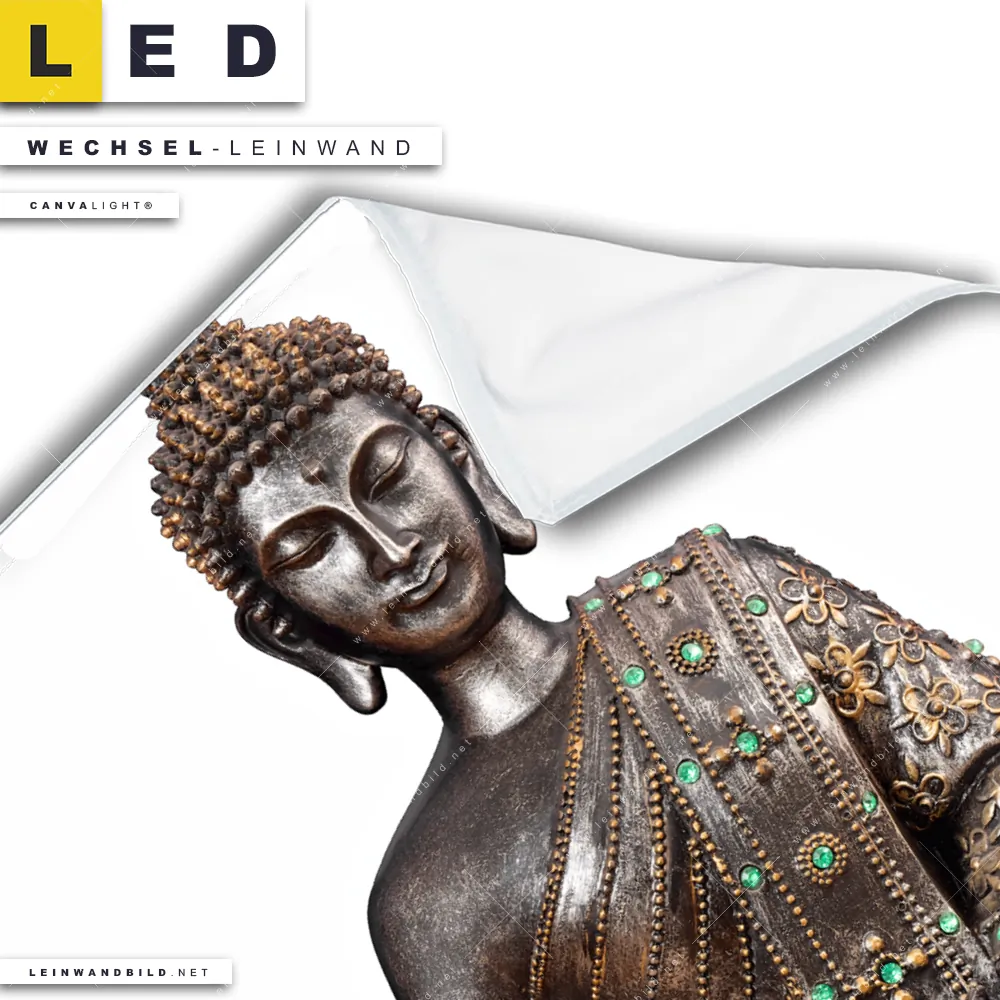 Bitte beachte, dass die Farben, der auf dem Monitor abgebildeten Buddha Statue weißer Hintergrund Darstellung, möglicherweise von den Originalfarben deiner Canvalight® TEX Wechsel-Leinwand abweichen können.