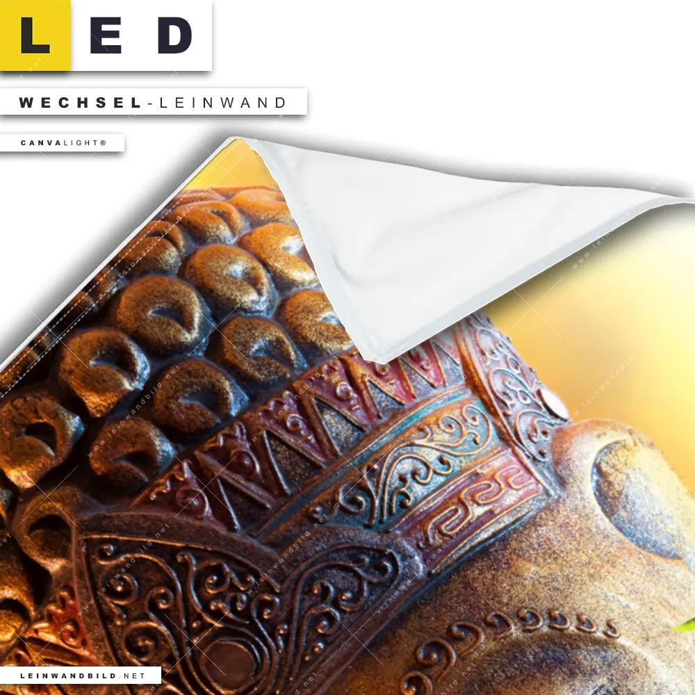 LED Wechsel-Leinwand Canvalight® TEX | Buddha Kopf & Seerose | Hochformat