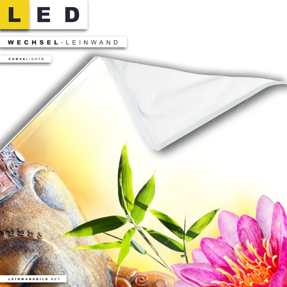 LED Wechsel-Leinwand Canvalight® TEX | Buddha Kopf & Seerose | Querformat