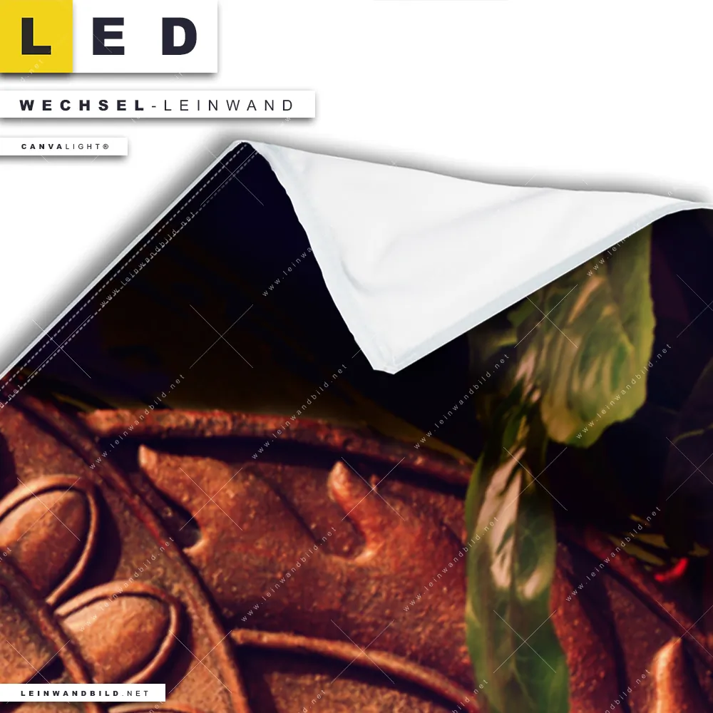 Bitte beachte, dass die Farben, der auf dem Monitor abgebildeten Lotusblüte in den Händen Buddhas Darstellung, möglicherweise von den Originalfarben deiner Canvalight® TEX Wechsel-Leinwand abweichen können.