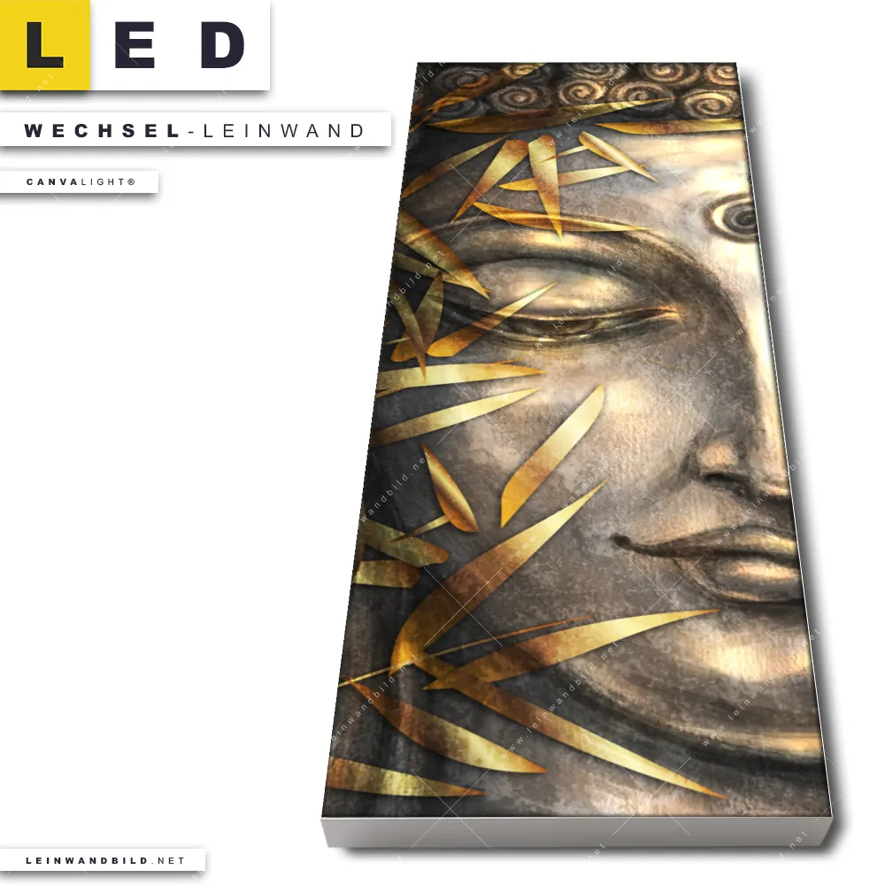 Du bist auf der Suche nach einer Buddha - Feng Shui Wechsel-Leinwand für Dein LED-Leinwandbild im Schmalen Format? Begriffe wie Buddha, Buddhismus, Religion, Feng Shui, Meditation, Bambus, Yoga haben Dich auf der Suche nach Deiner Ersatz-Leinwand für dein LED Wandbild im Panorama-Hochformat mit wechselbarer Leinwand inspiriert? Farben wie Gold, Silber dürfen auf Deinem neuen Wechselmotiv für Dein XXL Leinwand-LED-Bild nicht fehlen und Leinwände im Modern Art Stil für Leuchtbilder passen perfekt zu Deinem Einrichtungsstil?