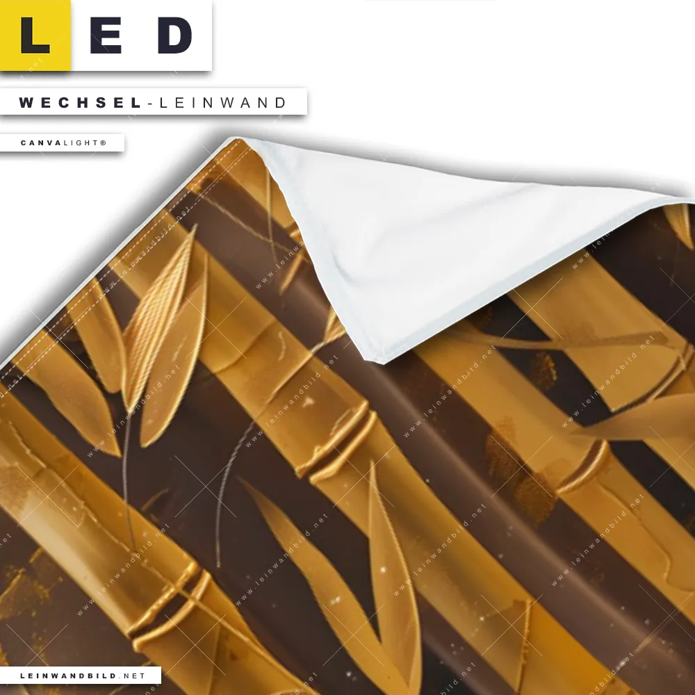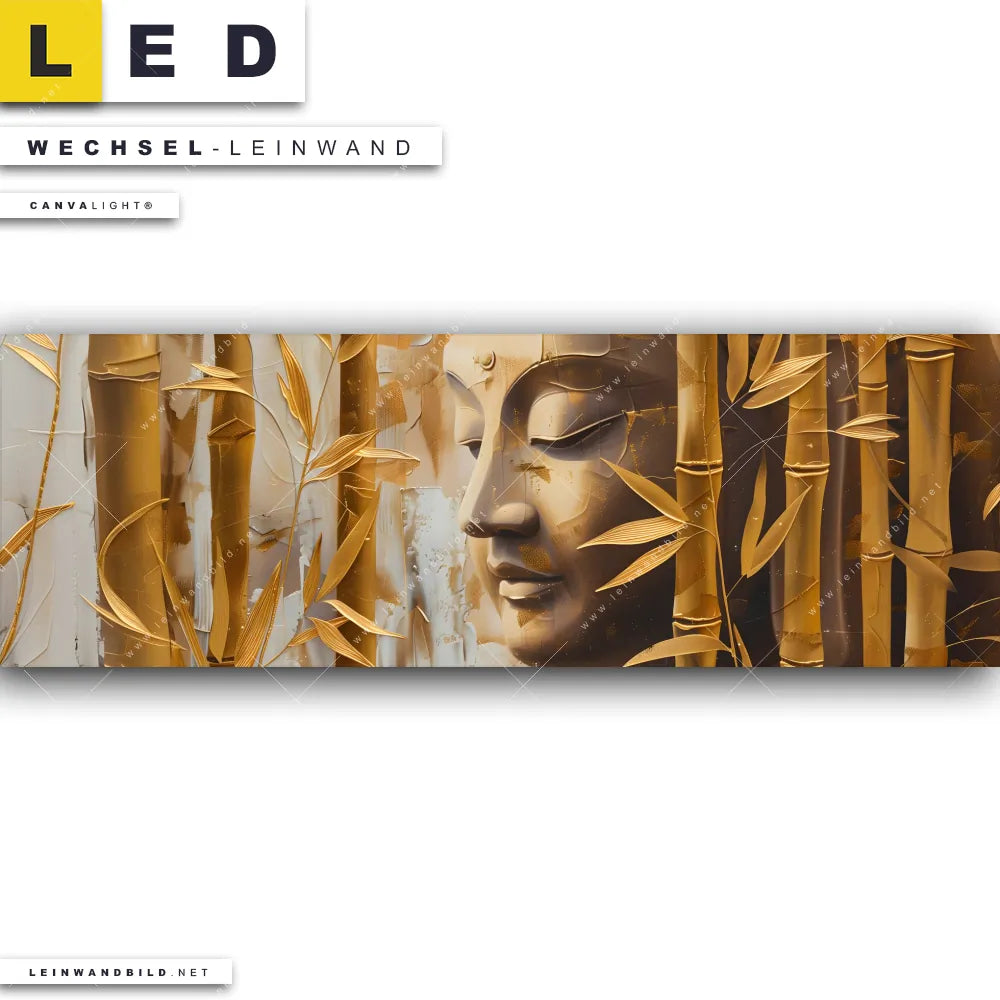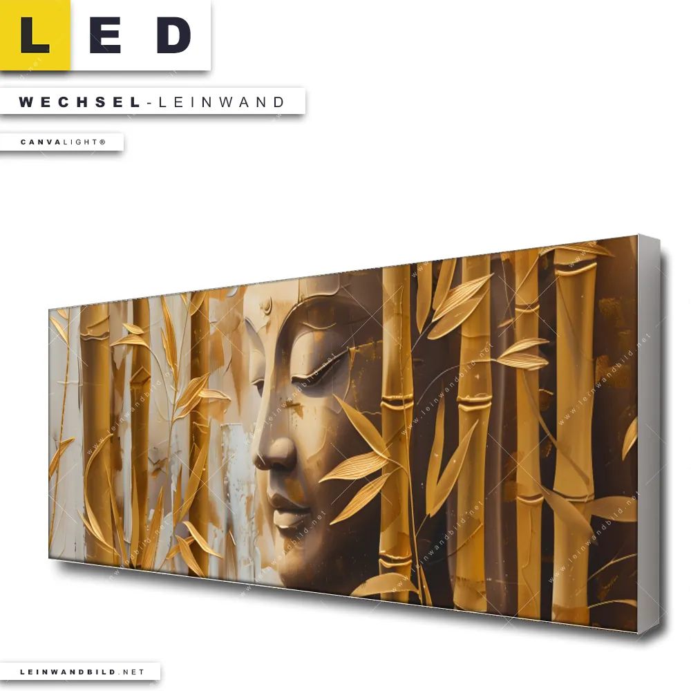 LED Wechsel-Leinwand Canvalight® TEX | Buddha-Statue im goldenen Bambus | Panorama