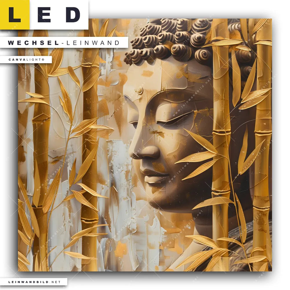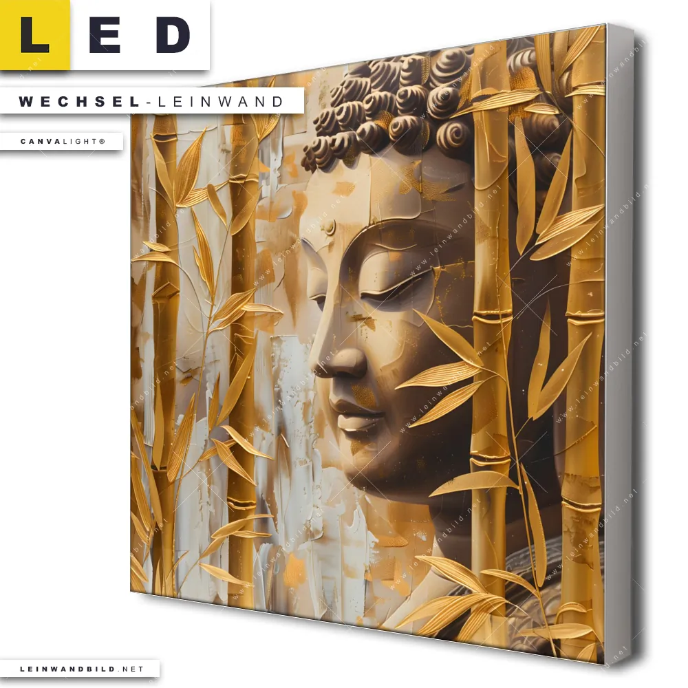 LED Wechsel-Leinwand Canvalight® TEX | Buddha-Statue im goldenen Bambus | Quadrat