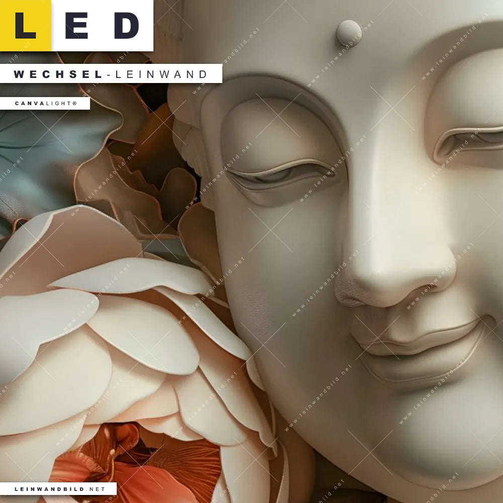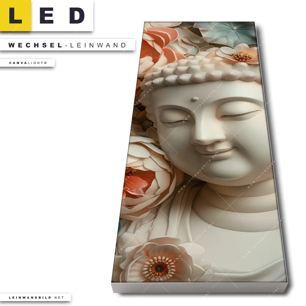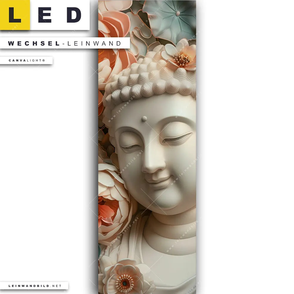Du bist auf der Suche nach einer Buddha - Feng Shui, Blumen - Botanik Wechsel-Leinwand für Dein LED-Leinwandbild im Schmalen Format? Begriffe wie Blüten, Statue, Spirituell, Buddhismus, Blumen, Buddha, Meditation, Religion haben Dich auf der Suche nach Deiner Ersatz-Leinwand für dein LED Wandbild im Panorama-Hochformat mit wechselbarer Leinwand inspiriert? Farben wie Beige, Orange, Blau dürfen auf Deinem neuen Wechselmotiv für Dein XXL Leinwand-LED-Bild nicht fehlen und Leinwände im Floral, Modern Art Stil für Leuchtbilder passen perfekt zu Deinem Einrichtungsstil?