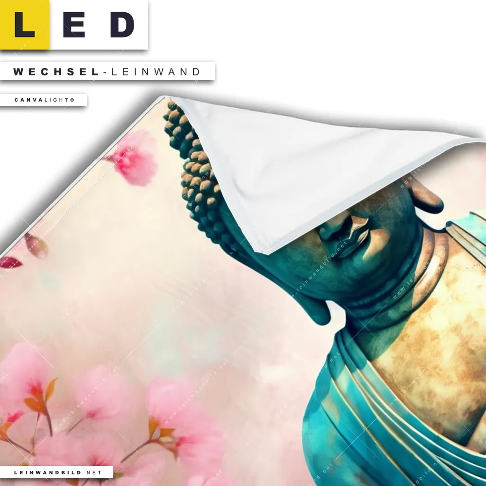 Dann sollte die Wechsel-Leinwand Canvalight® TEX | Buddha Statue mit Kirschblüten | Quadrat den Weg zu Dir finden. Die Austausch-Leinwand Buddha inmitten von Blüten - passend für unsere stufenlos dimmbaren, steckerfertigen Leinwandbilder im Leuchtrahmen mit Fernbedienung und optionaler Farbtemperatursteuerung - fügt sich als Eye-Catcher harmonisch in jedes Arzt - Praxis, Flur - Eingangsbereich, Wohnzimmer - Schlafzimmer, Büro - Kanzlei, Friseur - Beauty Raumkonzept ein.