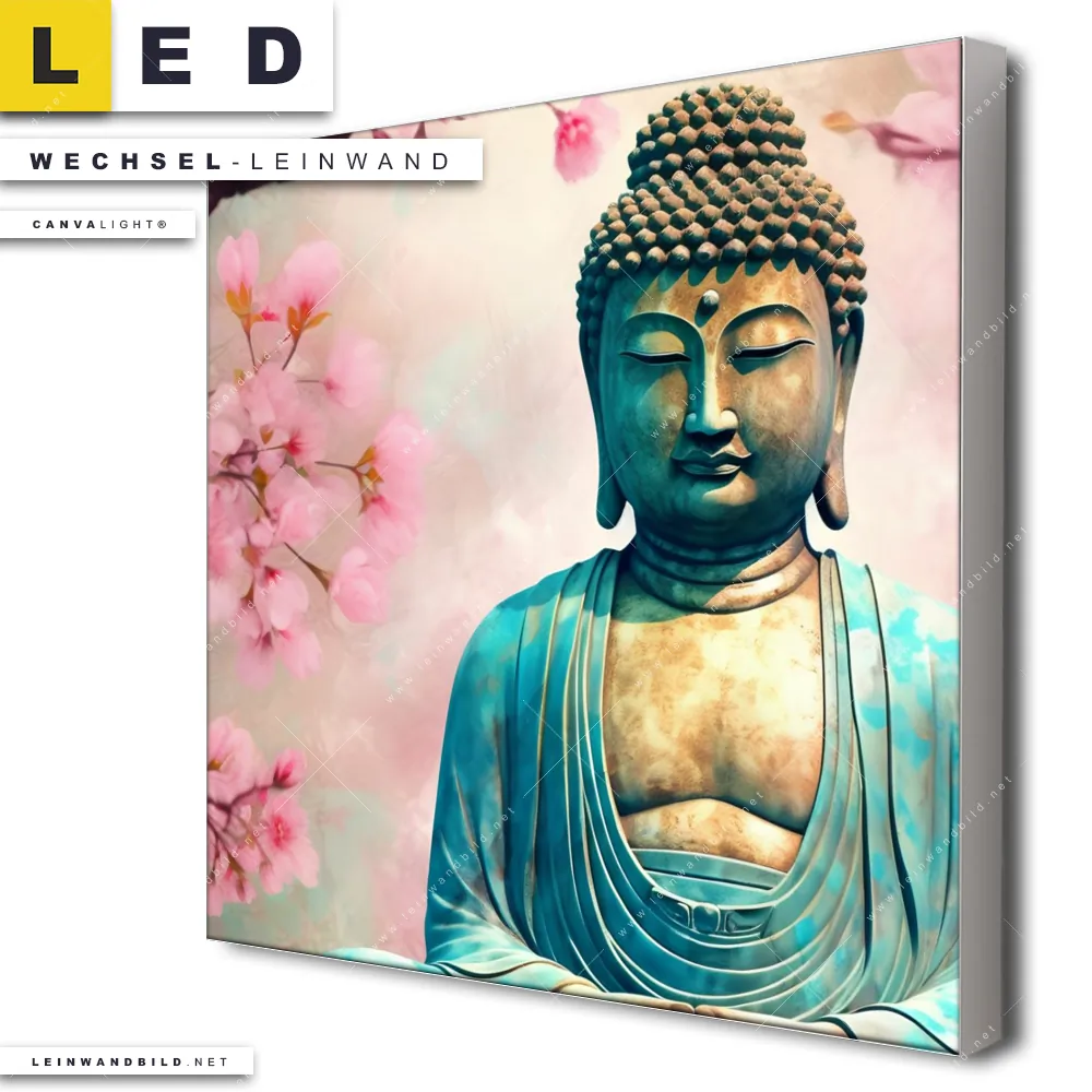Du konfigurierst Deine individuelle LED Wechsel-Leinwand Canvalight® TEX | Buddha Statue mit Kirschblüten | Quadrat und wir produzieren sie NEU für Dich. Unsere Buddha - Feng Shui, Blumen - Botanik Austausch-Fotoleinwände für Canvalight® LED Bilder sind KEINE Lagerware. Du bist Dir unsicher, welches Motiv oder Format das richtige für dein individuelles LED Wechselmotiv auf Leinwand ist, dann helfen wir dir gerne weiter und beraten dich!