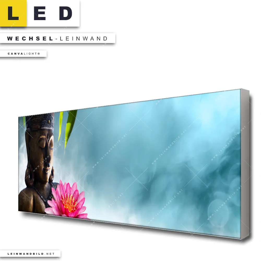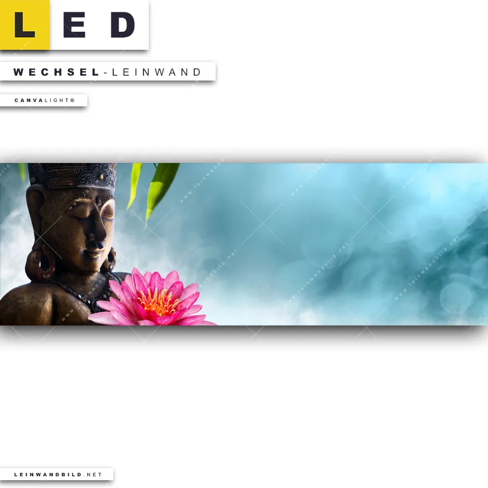 Du bist auf der Suche nach einer Buddha - Feng Shui Wechsel-Leinwand für Dein LED-Leinwandbild im Panorama-Format? Begriffe wie Buddha, Buddhismus, Religion, Feng Shui, Zen, Meditation, Seerose, Blume, Wasser, Bambus haben Dich auf der Suche nach Deiner Ersatz-Leinwand für dein extra breites LED Wandbild mit wechselbarer Leinwand inspiriert? Farben wie Türkis, Pink, Grün, Braun dürfen auf Deinem neuen Wechselmotiv für Dein XXL Leinwand-LED-Bild nicht fehlen und Leinwände im Mixed Media, Floral Stil für Leuchtbilder passen perfekt zu Deinem Einrichtungsstil?