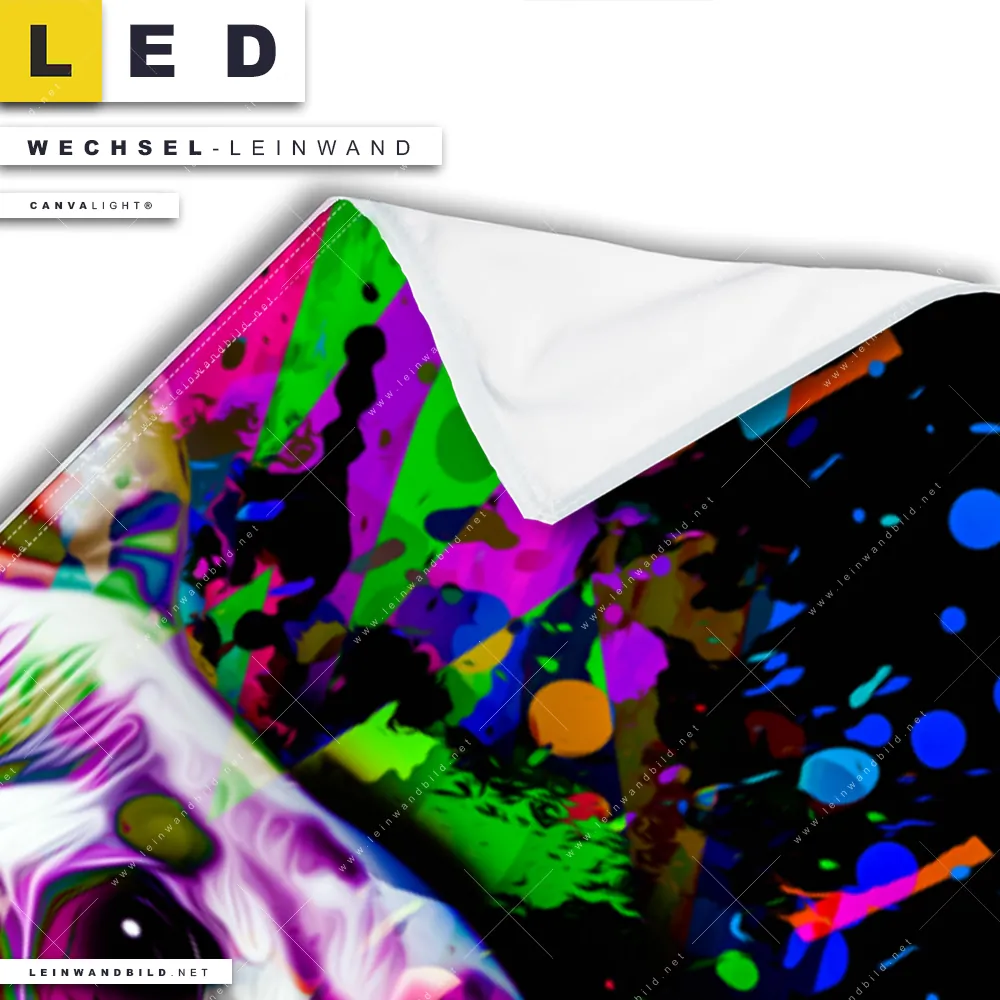 Dann sollte die Wechsel-Leinwand Canvalight® TEX | Bunte Bulldogge Schwarz | Panorama den Weg zu Dir finden. Die Austausch-Leinwand bunter Hundekopf - passend für unsere stufenlos dimmbaren, steckerfertigen Leinwandbilder im LED Leuchtrahmen mit Fernbedienung und optionaler Farbtemperatursteuerung - fügt sich als Eye-Catcher harmonisch in jedes Bar - Gastronomie, Wohnzimmer - Schlafzimmer, Flur - Eingangsbereich Raumkonzept ein.