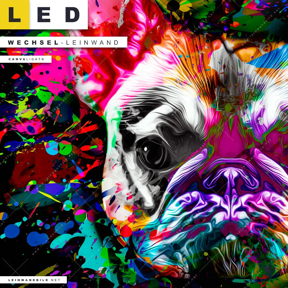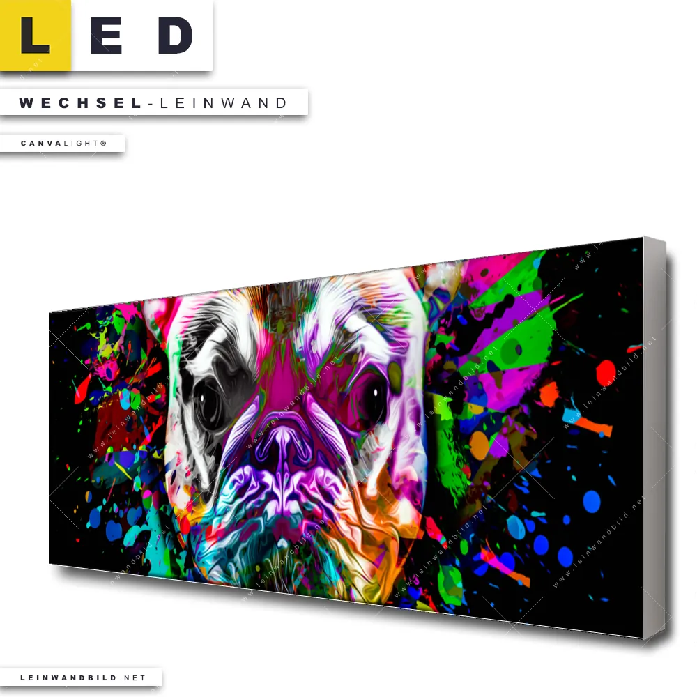 Du bist auf der Suche nach einer Tierwelt Wechsel-Leinwand für Dein LED-Leinwandbild im Panorama-Format? Begriffe wie Bulldogge, Tier, Hund, Splash, Farbspritzer, Französiche Bulldogge, Welpe haben Dich auf der Suche nach Deiner Ersatz-Leinwand für dein extra breites LED Wandbild mit wechselbarer Leinwand inspiriert? Farben wie Bunt, Schwarz dürfen auf Deinem neuen Wechselmotiv für Dein XXL Leinwand-LED-Bild nicht fehlen und Leinwände im Abstrakt, Modern Art, Pop Art Stil für Leuchtbilder passen perfekt zu Deinem Einrichtungsstil?