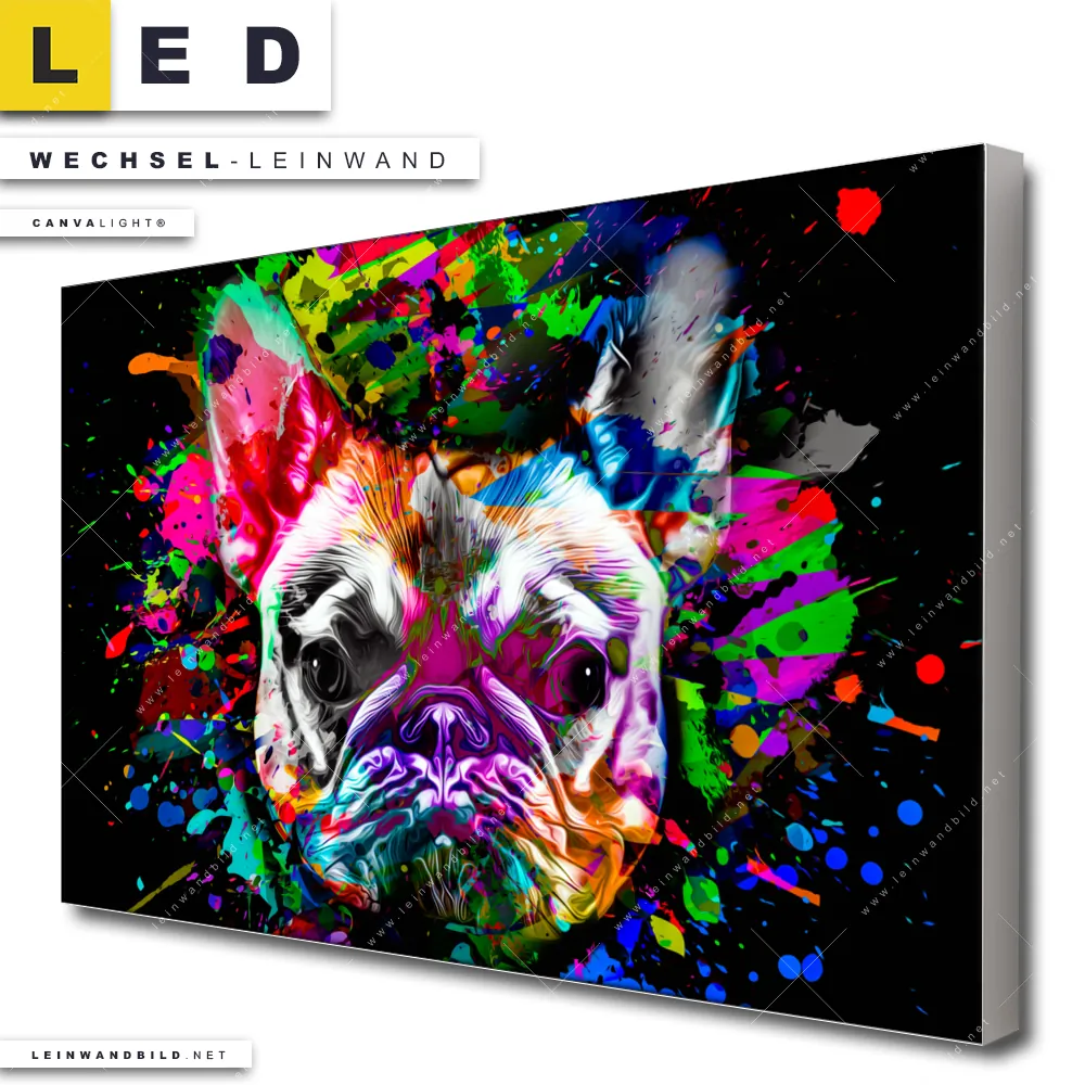 Du bist auf der Suche nach einer Tierwelt Wechsel-Leinwand für Dein LED-Leinwandbild im Querformat? Begriffe wie Bulldogge, Tier, Hund, Splash, Farbspritzer, Französiche Bulldogge, Welpe haben Dich auf der Suche nach Deiner Ersatz-Leinwand für dein breites LED Wandbild mit wechselbarer Leinwand inspiriert? Farben wie Bunt, Schwarz dürfen auf Deinem neuen Wechselmotiv für Dein XXL Leinwand-LED-Bild nicht fehlen und Leinwände im Abstrakt, Modern Art, Pop Art Stil für Leuchtbilder passen perfekt zu Deinem Einrichtungsstil?