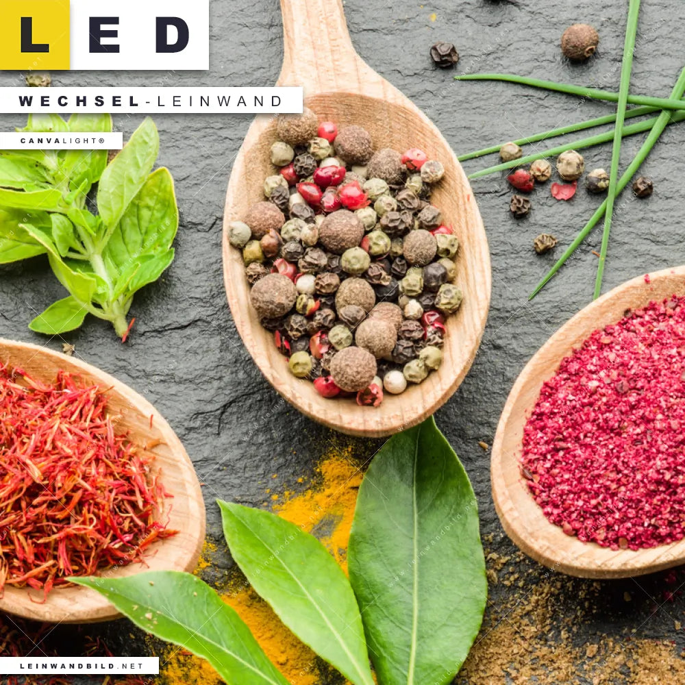 Du bist auf der Suche nach einer Essen - Trinken Wechsel-Leinwand für Dein LED-Leinwandbild im Panorama-Format? Begriffe wie Gewürze, Kräuter, Löffel, kochen, Pfeffer, Curry, Holzlöffel, Küche, Lebensmittel, gesund, Holz haben Dich auf der Suche nach Deiner Ersatz-Leinwand für dein extra breites LED Wandbild mit wechselbarer Leinwand inspiriert? Farben wie Braun, Grün, Orange, Rot dürfen auf Deinem neuen Wechselmotiv für Dein XXL Leinwand-LED-Bild nicht fehlen und Leinwände im Modern Art, Natürlich - Realistisch Stil für Leuchtbilder passen perfekt zu Deinem Einrichtungsstil?