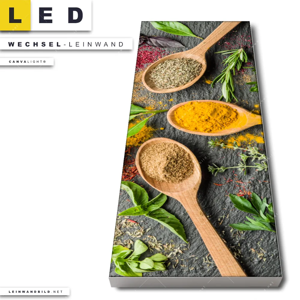 LED Wechsel-Leinwand Canvalight® TEX | Bunte Gewürze in Holzlöffeln | Schmal