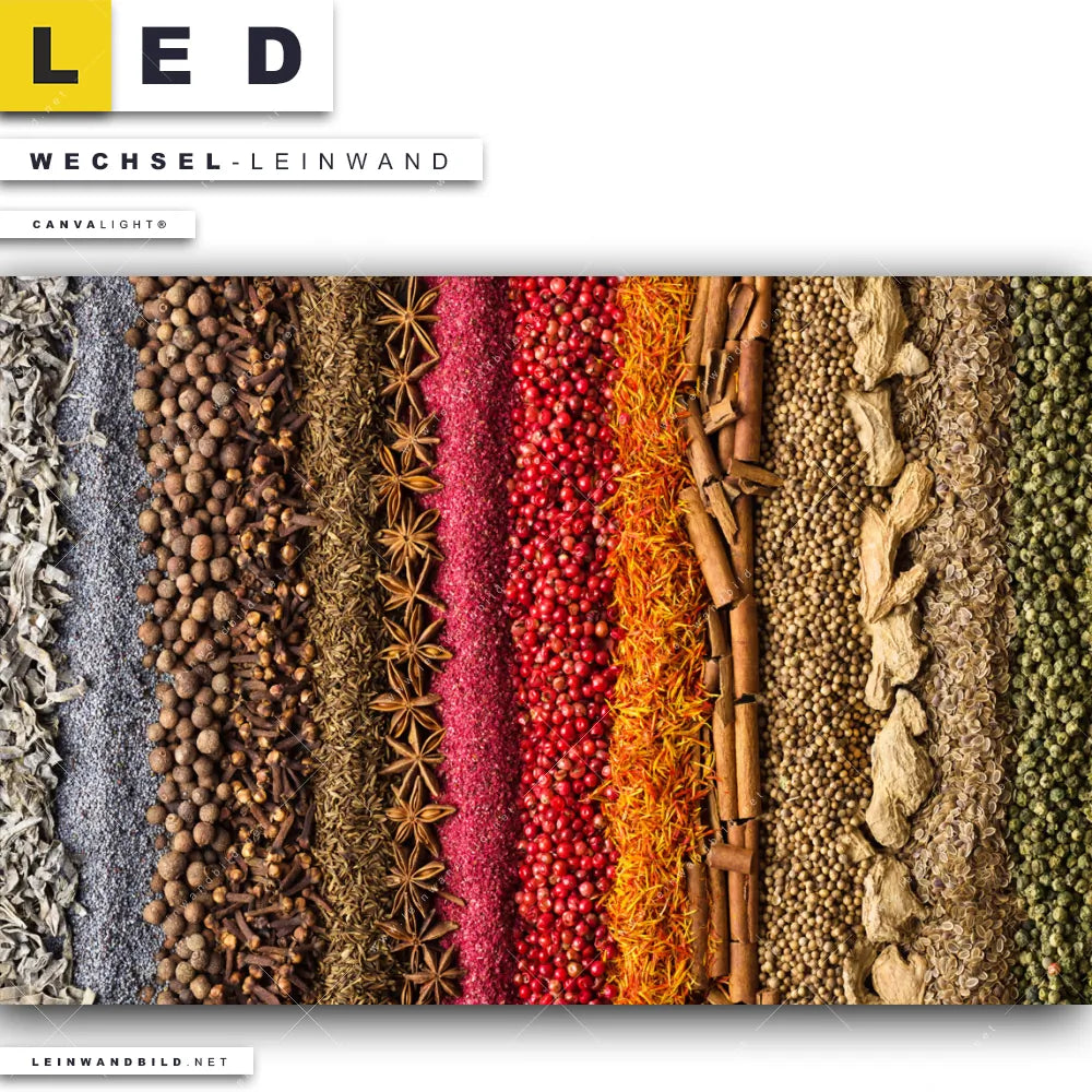 Du bist auf der Suche nach einer Essen - Trinken Wechsel-Leinwand für Dein LED-Leinwandbild im Querformat? Begriffe wie Gewürze, Kräuter, kochen, Chili, Pfeffer, Paprika, Lebensmittel, Ernährung, Essen, Zimt, Vanille haben Dich auf der Suche nach Deiner Ersatz-Leinwand für dein breites LED Wandbild mit wechselbarer Leinwand inspiriert? Farben wie Bunt dürfen auf Deinem neuen Wechselmotiv für Dein XXL Leinwand-LED-Bild nicht fehlen und Leinwände im Modern Art, Natürlich - Realistisch Stil für Leuchtbilder passen perfekt zu Deinem Einrichtungsstil?