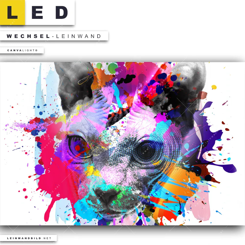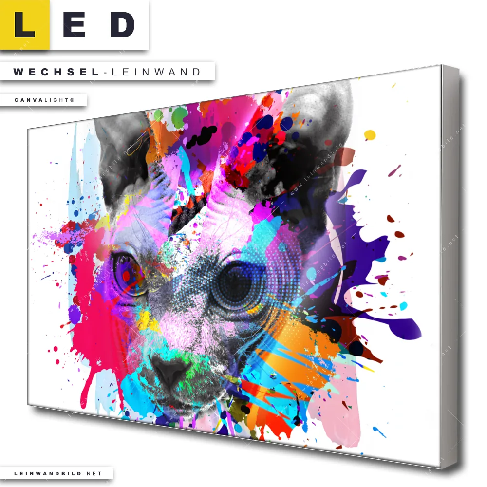 Dann sollte die Wechsel-Leinwand Canvalight® TEX | Bunte Sphynx Weiß | Querformat den Weg zu Dir finden. Die Austausch-Leinwand Sphynx-Katze abstrakt - passend für unsere stufenlos dimmbaren, steckerfertigen Leinwandbilder im Leuchtrahmen mit Fernbedienung und optionaler Farbtemperatursteuerung - fügt sich als Eye-Catcher harmonisch in jedes Bar - Gastronomie, Wohnzimmer - Schlafzimmer Raumkonzept ein.