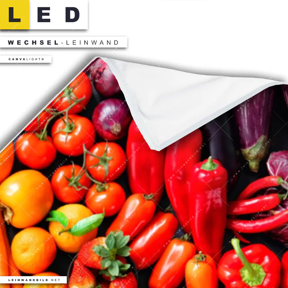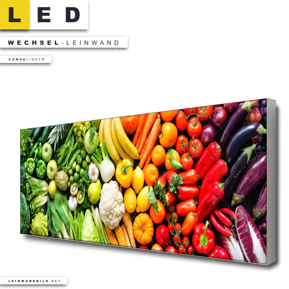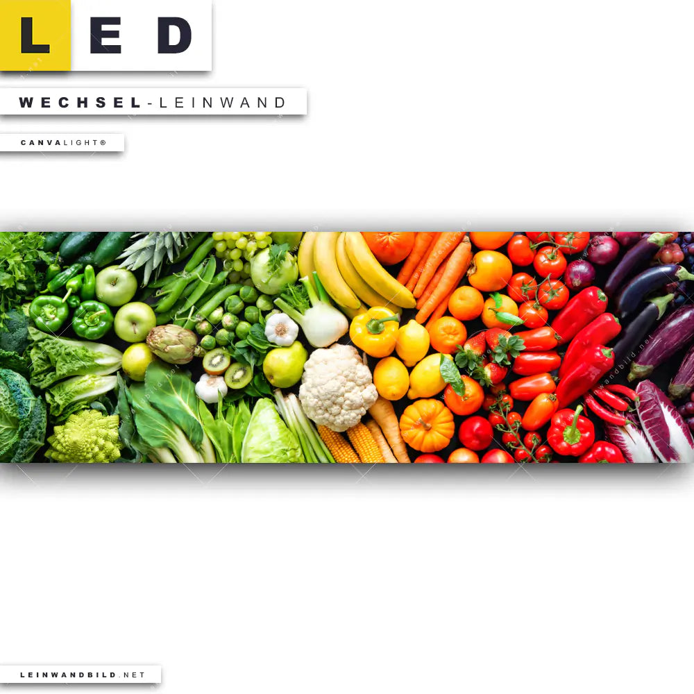 Du bist auf der Suche nach einer Essen - Trinken Wechsel-Leinwand für Dein LED-Leinwandbild im Panorama-Format? Begriffe wie Gemüse, Essen, gesund, Nahrung, Lebensmittel, Ernährung, Küche, Kochen, Gesundheit, Obst, Früchte haben Dich auf der Suche nach Deiner Ersatz-Leinwand für dein extra breites LED Wandbild mit wechselbarer Leinwand inspiriert? Farben wie Grün, Hellgrün, Lila, Rot, Orange, Gelb dürfen auf Deinem neuen Wechselmotiv für Dein XXL Leinwand-LED-Bild nicht fehlen und Leinwände im Natürlich - Realistisch Stil für Leuchtbilder passen perfekt zu Deinem Einrichtungsstil?