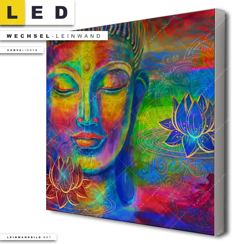 Du konfigurierst Deine individuelle LED Wechsel-Leinwand Canvalight® TEX | Bunter Buddha No.2 | Quadrat und wir produzieren sie NEU für Dich. Unsere Buddha - Feng Shui Austausch-Fotoleinwände für Canvalight® LED Bilder sind KEINE Lagerware. Du bist Dir unsicher, welches Motiv oder Format das richtige für dein individuelles LED Wechselmotiv auf Leinwand ist, dann helfen wir dir gerne weiter und beraten dich!