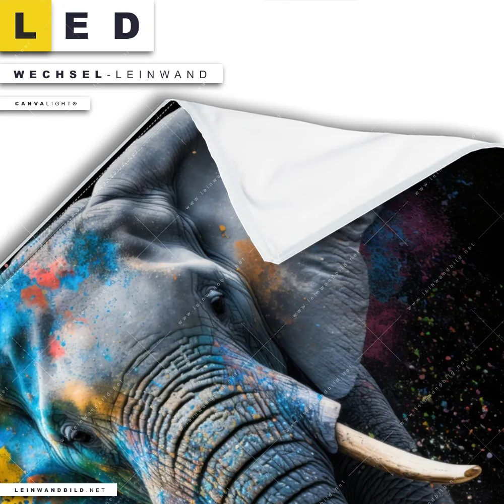 Bitte beachte, dass die Farben, der auf dem Monitor abgebildeten Elefant mit außergewöhnlicher Färbung Darstellung, möglicherweise von den Originalfarben deiner Canvalight® TEX Wechsel-Leinwand abweichen können.