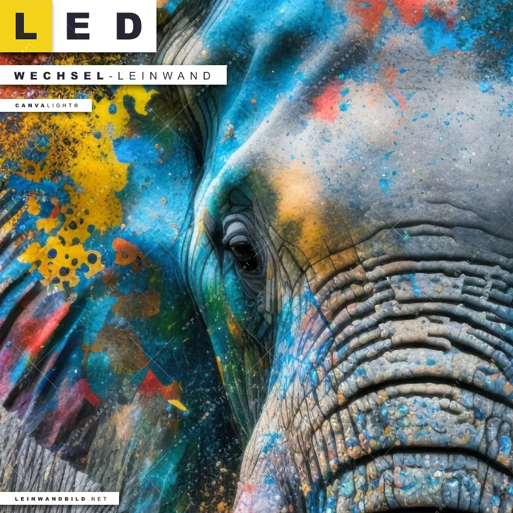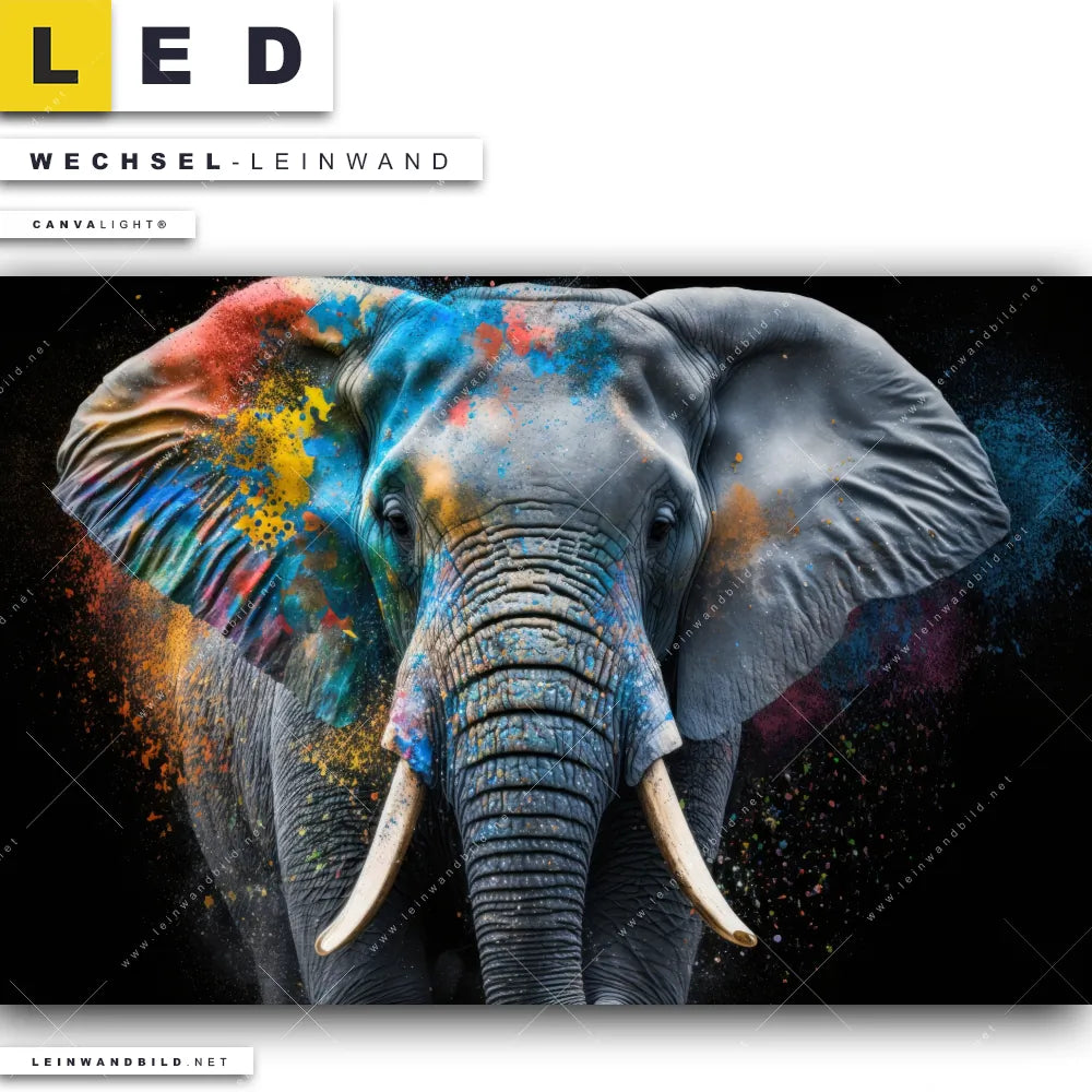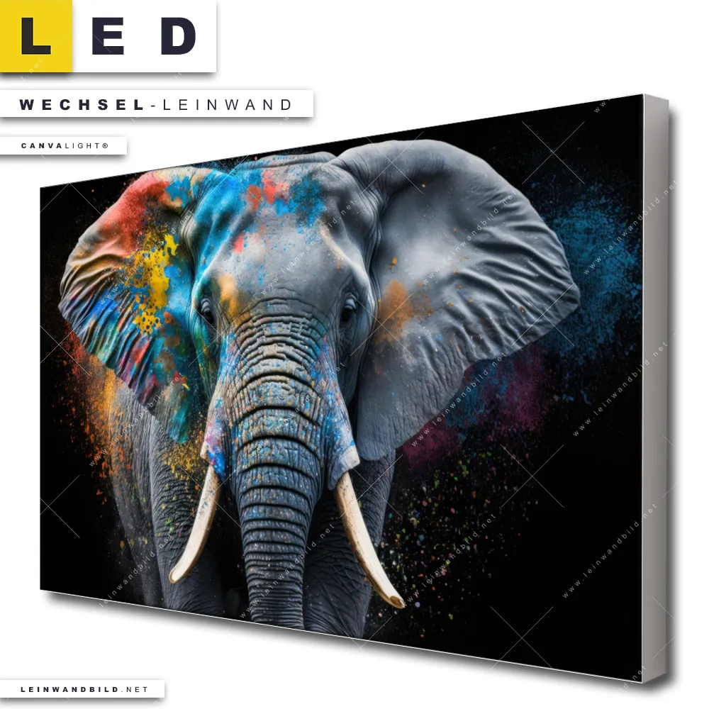 Du bist auf der Suche nach einer Tierwelt Wechsel-Leinwand für Dein LED-Leinwandbild im Querformat? Begriffe wie Elefant, Afrika, Big Five, Dickhäuter, Stoßzahn, Farbspritzer, Farbwolke, Dschungel haben Dich auf der Suche nach Deiner Ersatz-Leinwand für dein breites LED Wandbild mit wechselbarer Leinwand inspiriert? Farben wie Bunt dürfen auf Deinem neuen Wechselmotiv für Dein XXL Leinwand-LED-Bild nicht fehlen und Leinwände im Modern Art, Pop Art Stil für Leuchtbilder passen perfekt zu Deinem Einrichtungsstil?