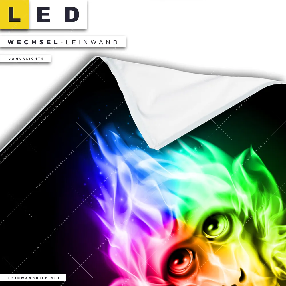 Bitte beachte, dass die Farben, der auf dem Monitor abgebildeten Affe mit regenbogenfarbenem Feuer Darstellung, möglicherweise von den Originalfarben deiner Canvalight® TEX Wechsel-Leinwand abweichen können.