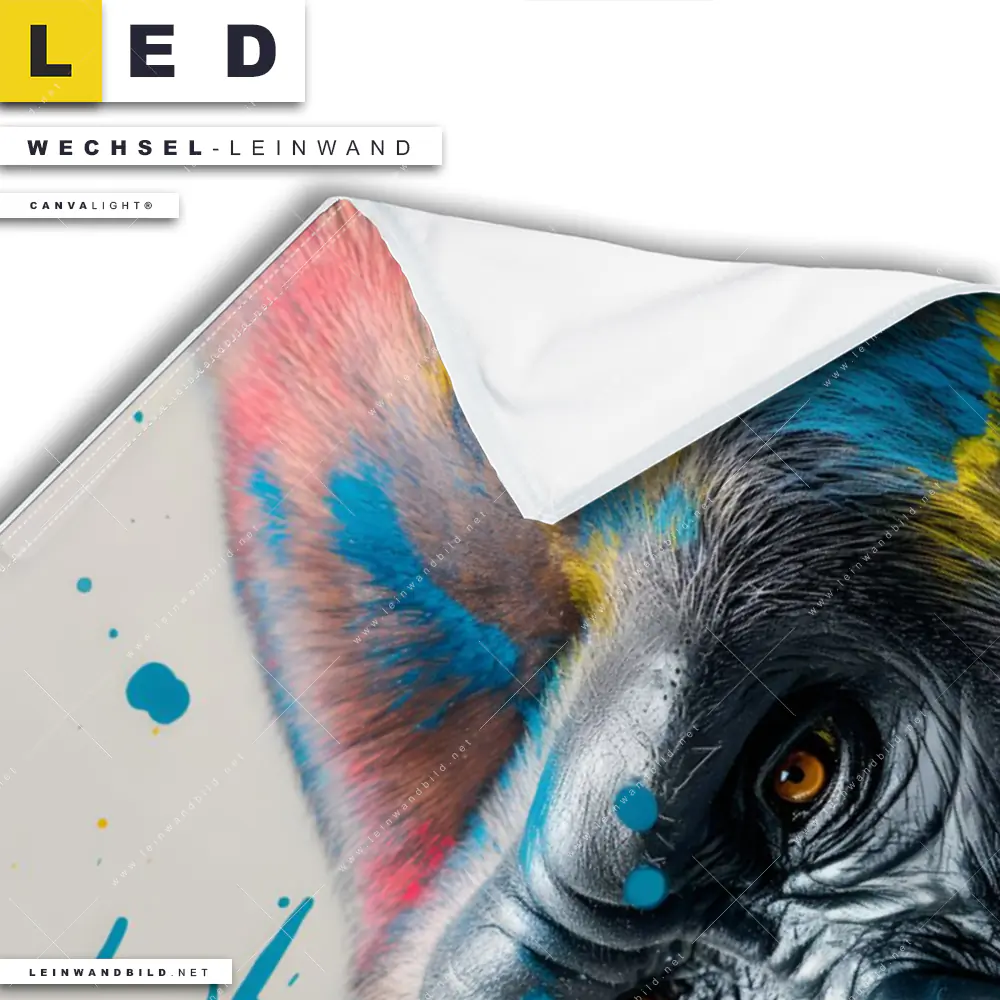 LED Wechsel-Leinwand Canvalight® TEX | Bunter Gorilla mit Farbspritzern | Hochformat