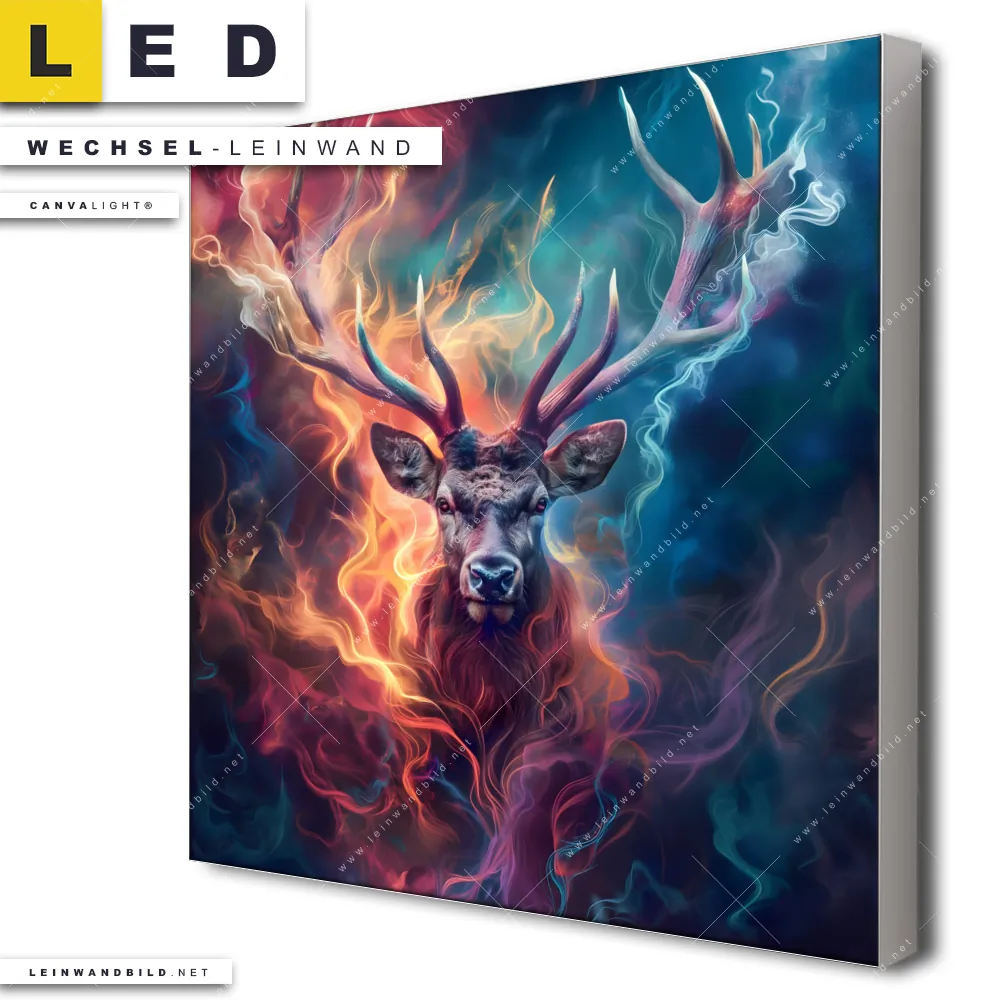 Dann sollte die Wechsel-Leinwand Canvalight® TEX | Bunter Hirsch in Flammen | Quadrat den Weg zu Dir finden. Die Austausch-Leinwand Leuchtender Hirsch im Rauch - passend für unsere stufenlos dimmbaren, steckerfertigen Leinwandbilder im Leuchtrahmen mit Fernbedienung und optionaler Farbtemperatursteuerung - fügt sich als Eye-Catcher harmonisch in jedes Wohnzimmer - Schlafzimmer, Flur - Eingangsbereich, Büro - Kanzlei Raumkonzept ein.