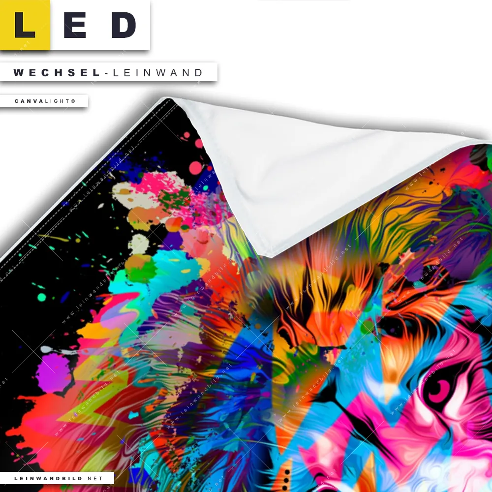 LED Wechsel-Leinwand Canvalight® TEX | Bunter Löwe Schwarz | Hochformat