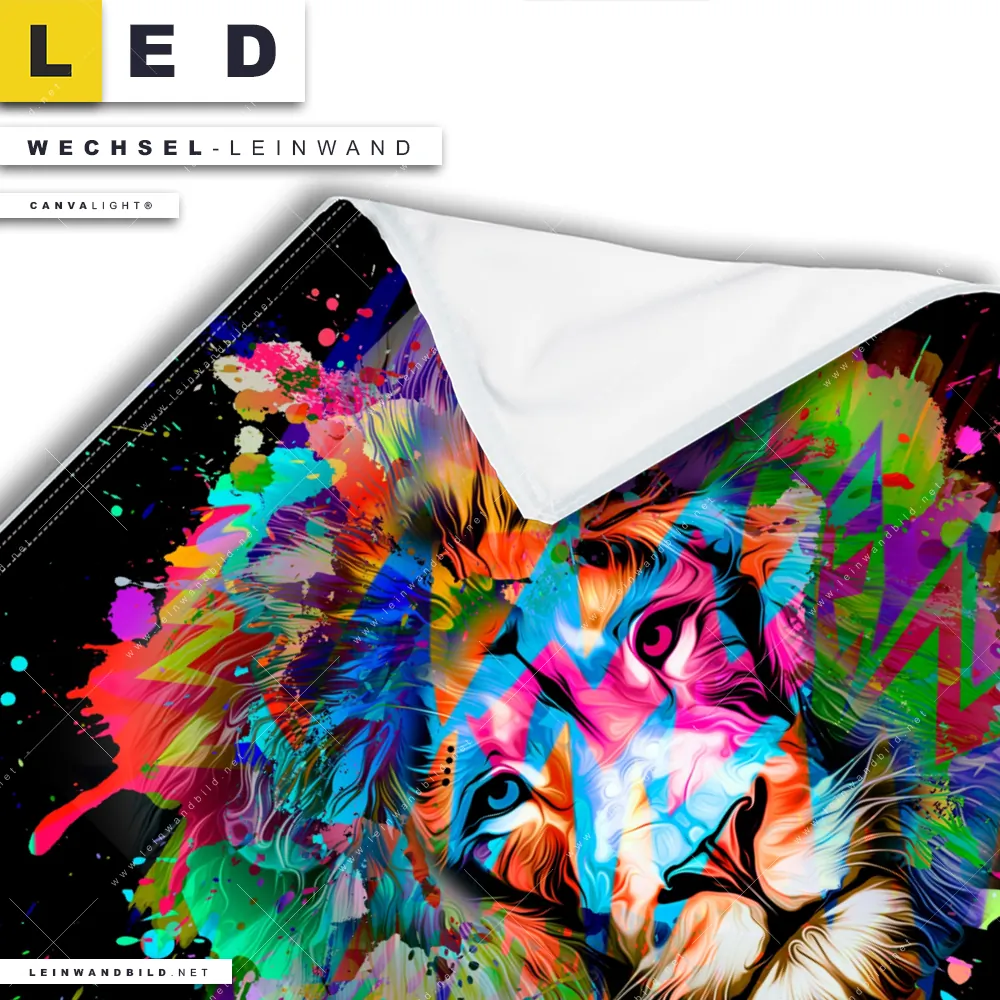 Du konfigurierst Deine individuelle LED Wechsel-Leinwand Canvalight® TEX | Bunter Löwe Schwarz | Quadrat und wir produzieren sie NEU für Dich. Unsere Tierwelt Austausch-Fotoleinwände für Canvalight® LED Bilder sind KEINE Lagerware. Du bist Dir unsicher, welches Motiv oder Format das richtige für dein individuelles LED Wechselmotiv auf Leinwand ist, dann helfen wir dir gerne weiter und beraten dich!