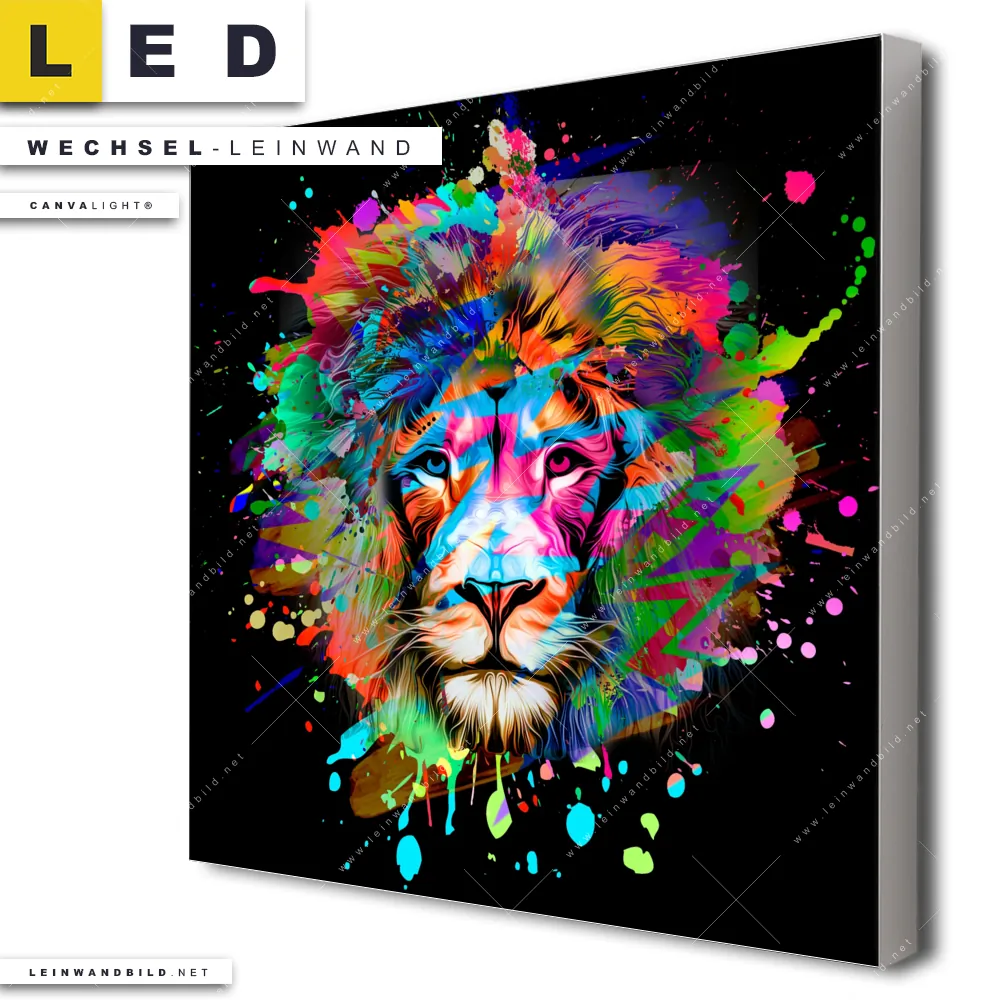 Du bist auf der Suche nach einer Tierwelt Wechsel-Leinwand für Dein LED-Leinwandbild im Quadratischen Format? Begriffe wie Raubkatze, Löwe, Afrika, Dschungel, Lion, Splash, Farbspritzer, Farbexplosion, Porträt, Farbe haben Dich auf der Suche nach Deiner Ersatz-Leinwand für dein LED Wandbild mit wechselbarer Leinwand inspiriert? Farben wie Bunt dürfen auf Deinem neuen Wechselmotiv für Dein XXL Leinwand-LED-Bild nicht fehlen und Leinwände im Abstrakt, Modern Art, Pop Art, Street Art Stil für Leuchtbilder passen perfekt zu Deinem Einrichtungsstil?