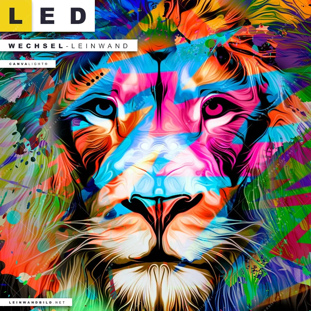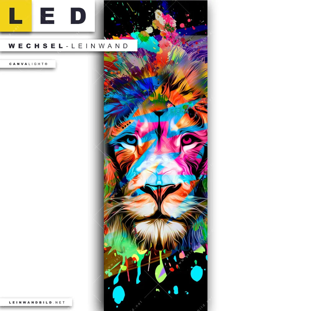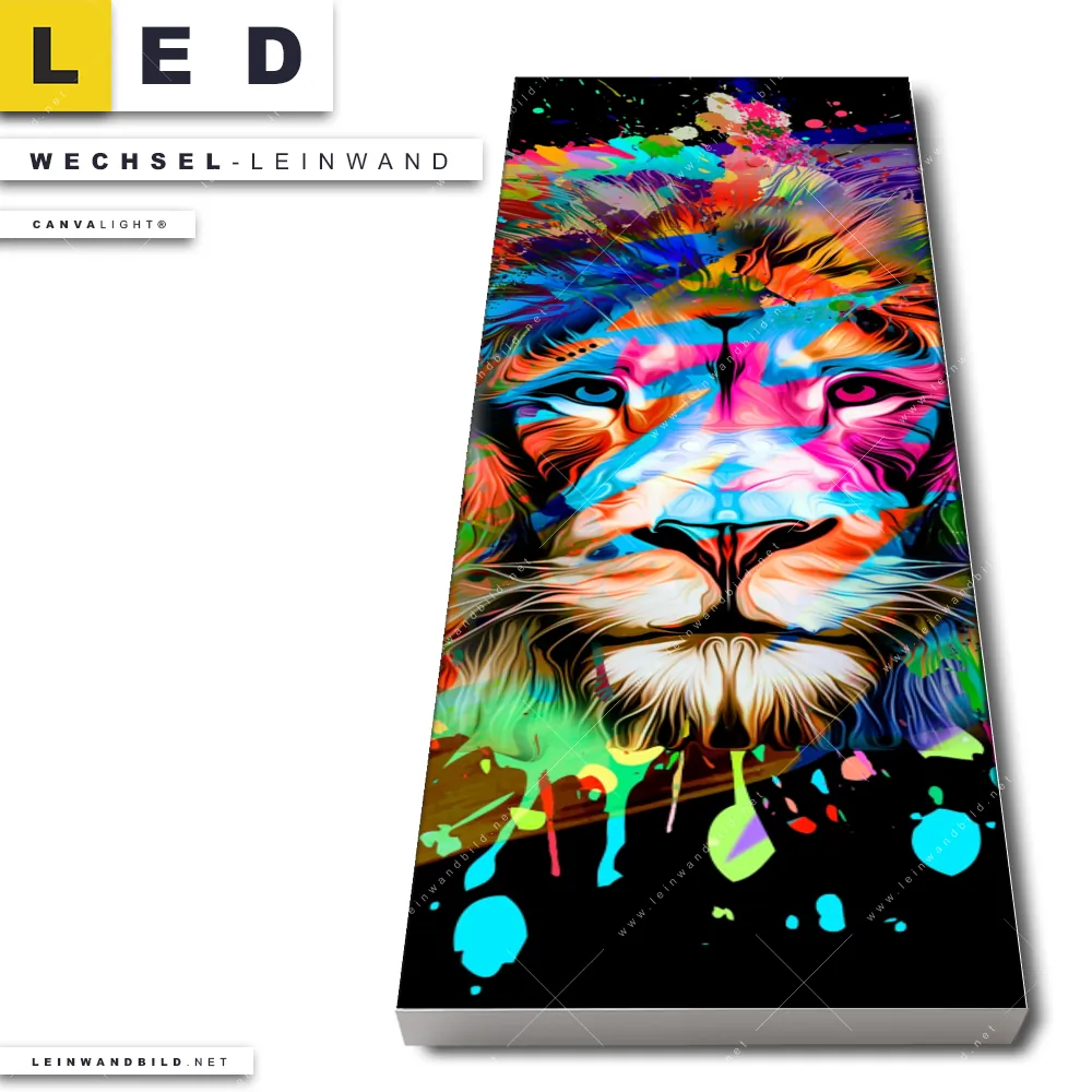 Du bist auf der Suche nach einer Tierwelt Wechsel-Leinwand für Dein LED-Leinwandbild im Schmalen Format? Begriffe wie Raubkatze, Löwe, Afrika, Dschungel, Lion, Splash, Farbspritzer, Farbexplosion, Porträt, Farbe haben Dich auf der Suche nach Deiner Ersatz-Leinwand für dein LED Wandbild im Panorama-Hochformat mit wechselbarer Leinwand inspiriert? Farben wie Bunt dürfen auf Deinem neuen Wechselmotiv für Dein XXL Leinwand-LED-Bild nicht fehlen und Leinwände im Abstrakt, Modern Art, Pop Art, Street Art Stil für Leuchtbilder passen perfekt zu Deinem Einrichtungsstil?