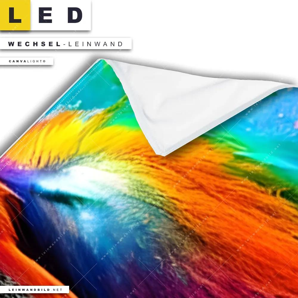 Bitte beachte, dass die Farben, der auf dem Monitor abgebildeten Orang-Utan in bunten Farben Darstellung, möglicherweise von den Originalfarben deiner Canvalight® TEX Wechsel-Leinwand abweichen können.