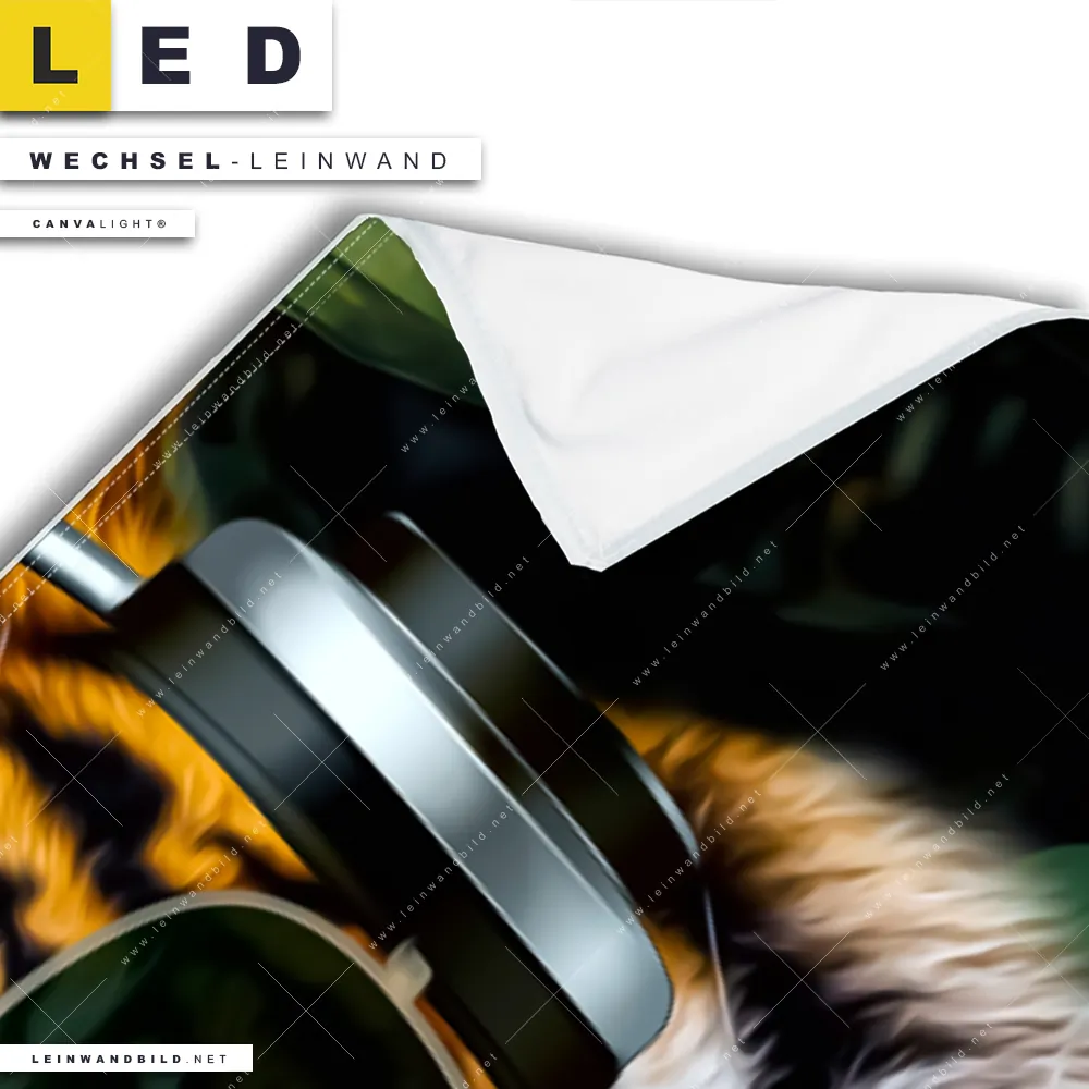 Bitte beachte, dass die Farben, der auf dem Monitor abgebildeten Tiger mit Kopfhörern Darstellung, möglicherweise von den Originalfarben deiner Canvalight® TEX Wechsel-Leinwand abweichen können.