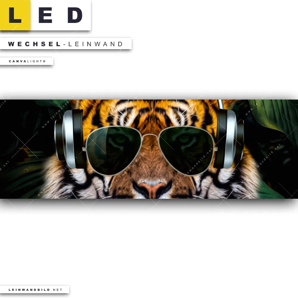 Dann sollte die Wechsel-Leinwand Canvalight® TEX | Cooler Tiger | Panorama den Weg zu Dir finden. Die Austausch-Leinwand coole Raubkatze - passend für unsere stufenlos dimmbaren, steckerfertigen Leinwandbilder im LED Leuchtrahmen mit Fernbedienung und optionaler Farbtemperatursteuerung - fügt sich als Eye-Catcher harmonisch in jedes Bar - Gastronomie, Wohnzimmer - Schlafzimmer, Büro - Kanzlei, Flur - Eingangsbereich Raumkonzept ein.