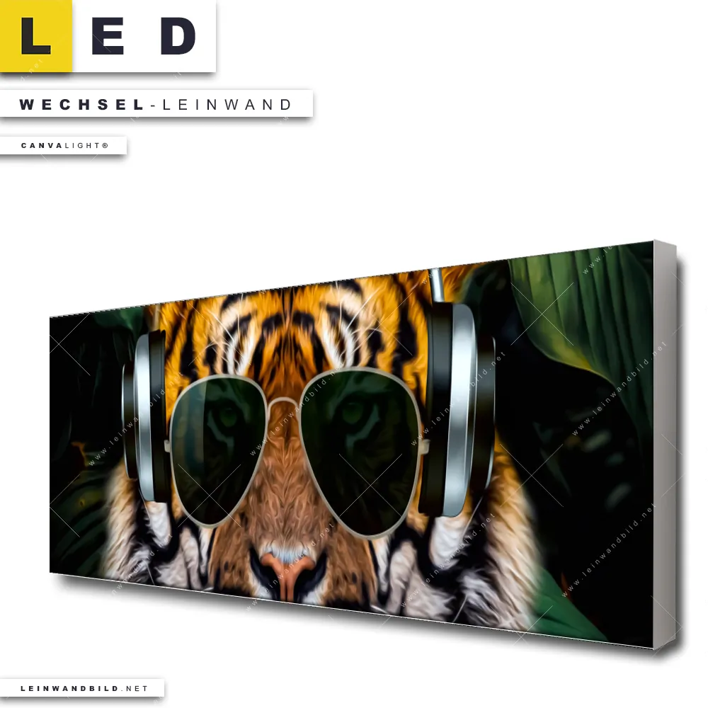 Du konfigurierst Deine individuelle LED Wechsel-Leinwand Canvalight® TEX | Cooler Tiger | Panorama und wir produzieren sie NEU für Dich. Unsere Tierwelt Austausch-Fotoleinwände für Canvalight® LED Bilder sind KEINE Lagerware. Du bist Dir unsicher, welches Motiv oder Format das richtige für dein individuelles LED Wechselmotiv auf Leinwand ist, dann helfen wir dir gerne weiter und beraten dich!