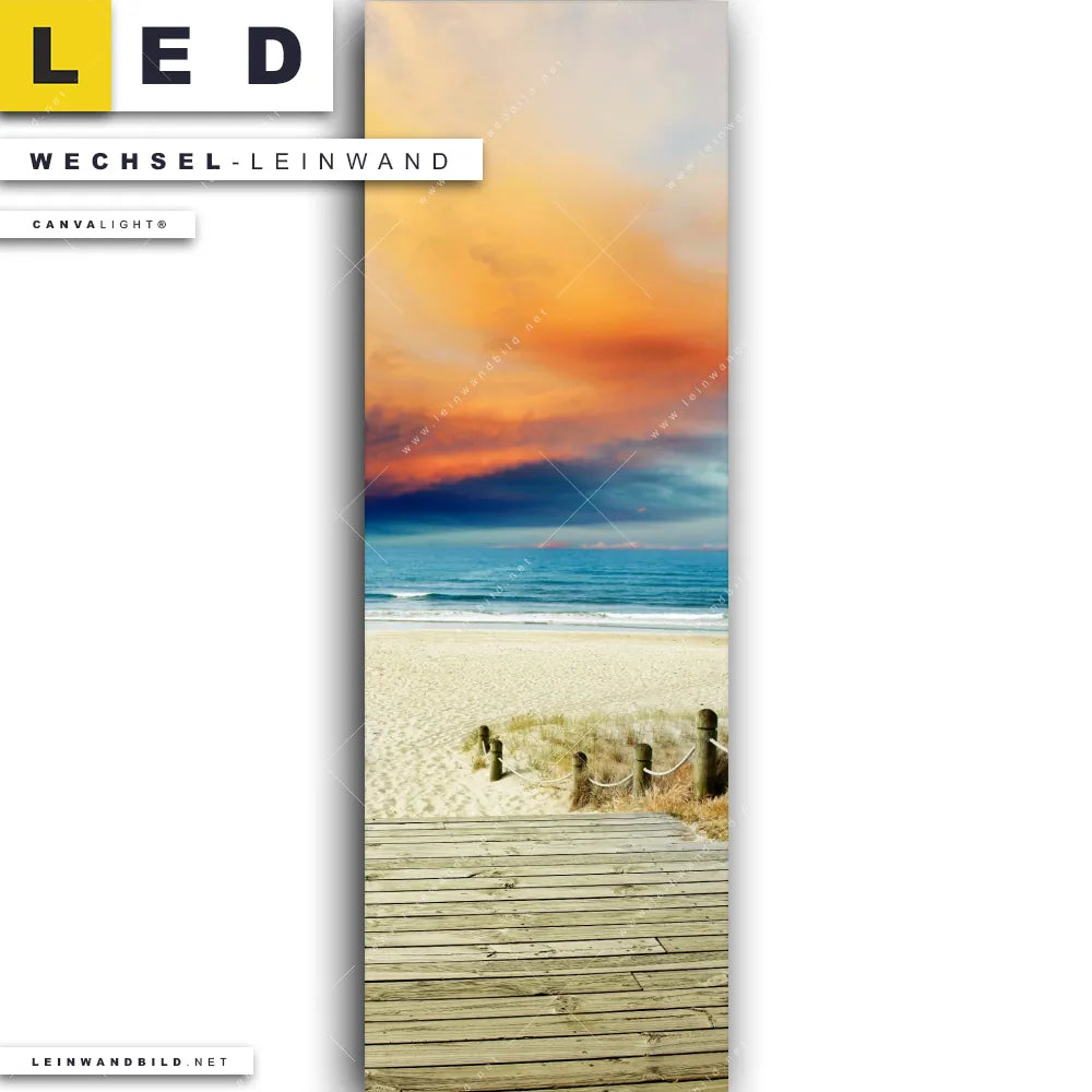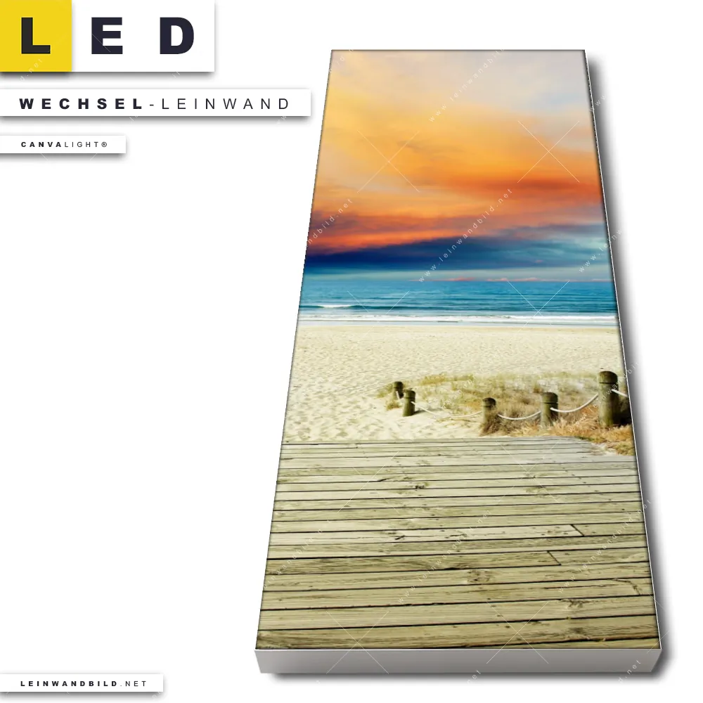 Du bist auf der Suche nach einer Landschaften, Strand - Meer Wechsel-Leinwand für Dein LED-Leinwandbild im Schmalen Format? Begriffe wie Meer, Sonnenuntergang, Strand, Treppe, Weg, Herbst haben Dich auf der Suche nach Deiner Ersatz-Leinwand für dein LED Wandbild im Panorama-Hochformat mit wechselbarer Leinwand inspiriert? Farben wie Blau, Orange, Beige dürfen auf Deinem neuen Wechselmotiv für Dein XXL Leinwand-LED-Bild nicht fehlen und Leinwände im Natürlich - Realistisch Stil für Leuchtbilder passen perfekt zu Deinem Einrichtungsstil?