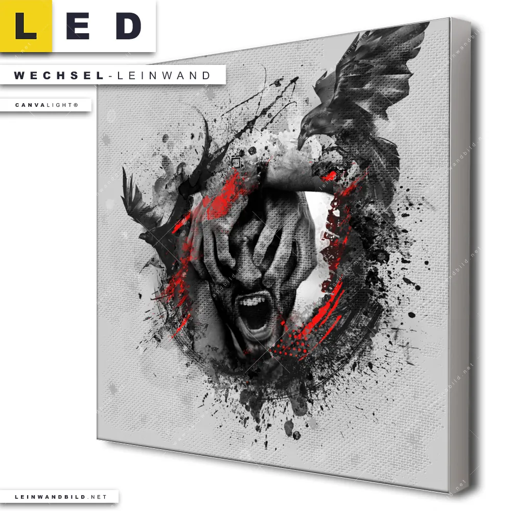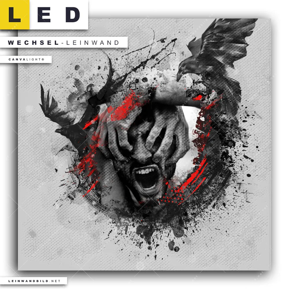 Du bist auf der Suche nach einer Porträts - Menschen Wechsel-Leinwand für Dein LED-Leinwandbild im Quadratischen Format? Begriffe wie Vögel, Raben, Krähen, Grunge, Streetart, modern, Porträt, Mann, Gesicht haben Dich auf der Suche nach Deiner Ersatz-Leinwand für dein LED Wandbild mit wechselbarer Leinwand inspiriert? Farben wie Weiss, Schwarz, Rot dürfen auf Deinem neuen Wechselmotiv für Dein XXL Leinwand-LED-Bild nicht fehlen und Leinwände im Grunge, Mixed Media, Modern Art, Schwarz - Weiss Stil für Leuchtbilder passen perfekt zu Deinem Einrichtungsstil?