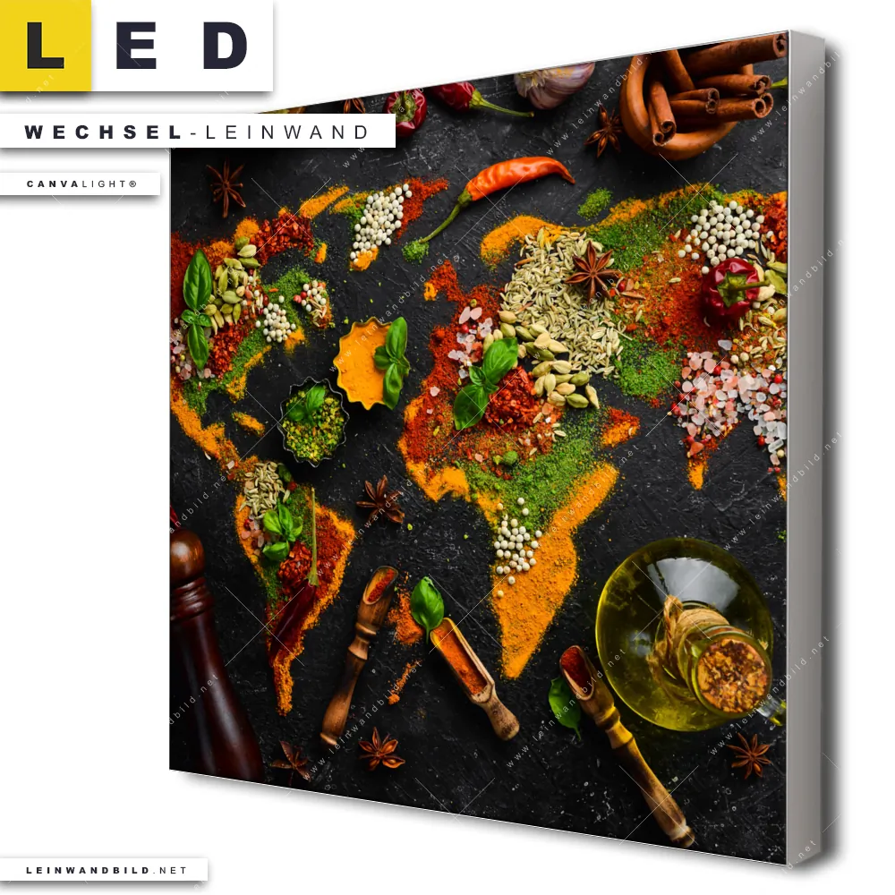 Du konfigurierst Deine individuelle LED Wechsel-Leinwand Canvalight® TEX | Die Weltkarte der Gewürze | Quadrat und wir produzieren sie NEU für Dich. Unsere Essen - Trinken Austausch-Fotoleinwände für Canvalight® LED Bilder sind KEINE Lagerware. Du bist Dir unsicher, welches Motiv oder Format das richtige für dein individuelles LED Wechselmotiv auf Leinwand ist, dann helfen wir dir gerne weiter und beraten dich!