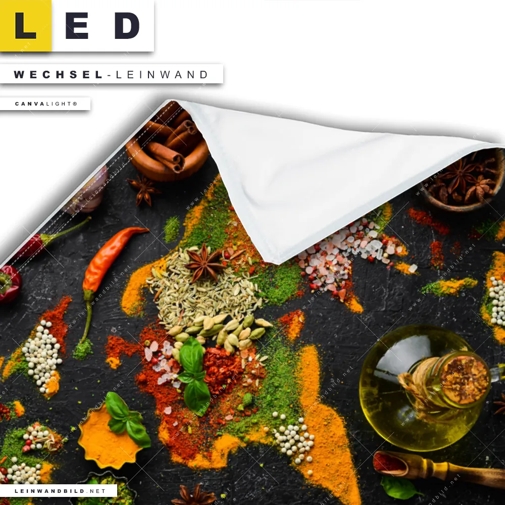 Du bist auf der Suche nach einer Essen - Trinken Wechsel-Leinwand für Dein LED-Leinwandbild im Querformat? Begriffe wie Gewürze, Chili, Öl, Minze, Curry, Kräuter, Essen, Gesund, Pfeffermühle, Zimt, Sternanis haben Dich auf der Suche nach Deiner Ersatz-Leinwand für dein breites LED Wandbild mit wechselbarer Leinwand inspiriert? Farben wie Braun, Bunt, Beige, Weiss, Gelb , Grau , Grün, Hellblau, Hellgrün, Mint, Ocker, Orange, Rot, Rosa dürfen auf Deinem neuen Wechselmotiv für Dein XXL Leinwand-LED-Bild nicht fehlen und Leinwände im Natürlich - Realistisch Stil für Leuchtbilder passen perfekt zu Deinem Einrichtungsstil?