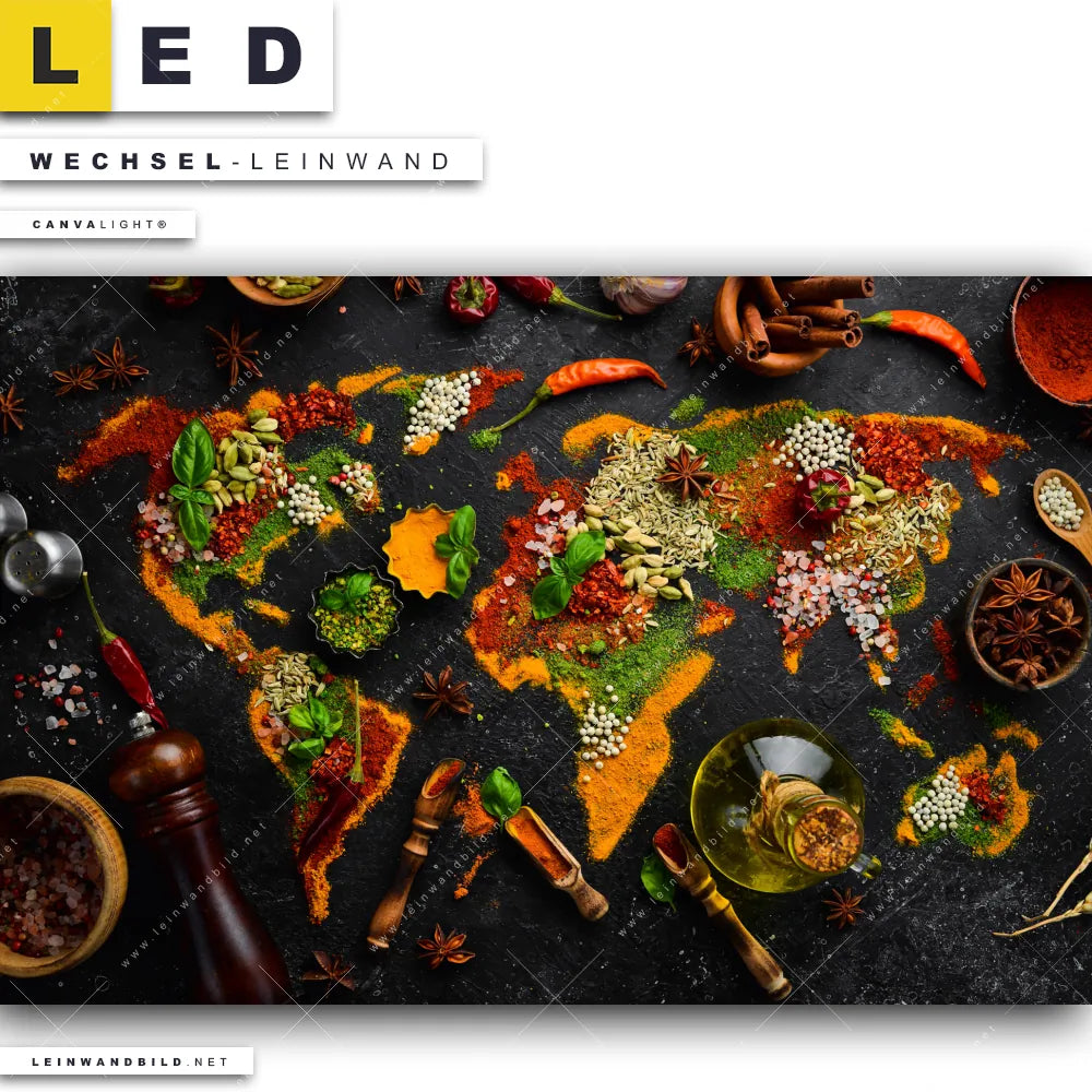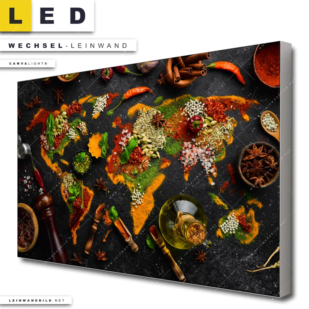 LED Wechsel-Leinwand Canvalight® TEX | Die Weltkarte der Gewürze | Querformat