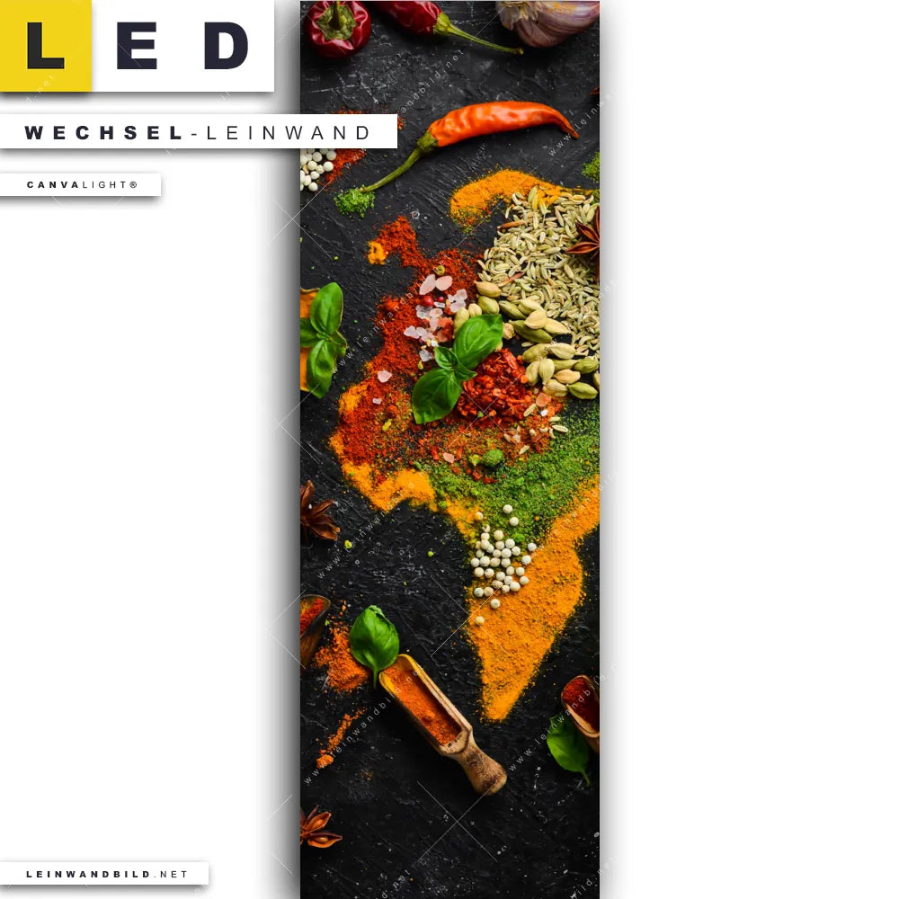 Du konfigurierst Deine individuelle LED Wechsel-Leinwand Canvalight® TEX | Die Weltkarte der Gewürze | Schmal und wir produzieren sie NEU für Dich. Unsere Essen - Trinken Austausch-Fotoleinwände für Canvalight® LED Bilder sind KEINE Lagerware. Du bist Dir unsicher, welches Motiv oder Format das richtige für dein individuelles LED Wechselmotiv auf Leinwand ist, dann helfen wir dir gerne weiter und beraten dich!
