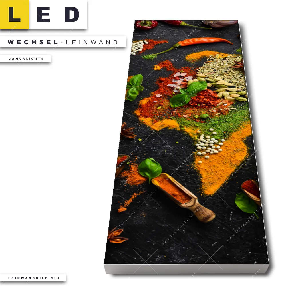 Du bist auf der Suche nach einer Essen - Trinken Wechsel-Leinwand für Dein LED-Leinwandbild im Schmalen Format? Begriffe wie Gewürze, Chili, Öl, Minze, Curry, Kräuter, Essen, Gesund, Pfeffermühle, Zimt, Sternanis haben Dich auf der Suche nach Deiner Ersatz-Leinwand für dein LED Wandbild im Panorama-Hochformat mit wechselbarer Leinwand inspiriert? Farben wie Braun, Bunt, Beige, Weiss, Gelb , Grau , Grün, Hellblau, Hellgrün, Mint, Ocker, Orange, Rot, Rosa dürfen auf Deinem neuen Wechselmotiv für Dein XXL Leinwand-LED-Bild nicht fehlen und Leinwände im Natürlich - Realistisch Stil für Leuchtbilder passen perfekt zu Deinem Einrichtungsstil?