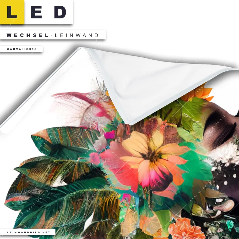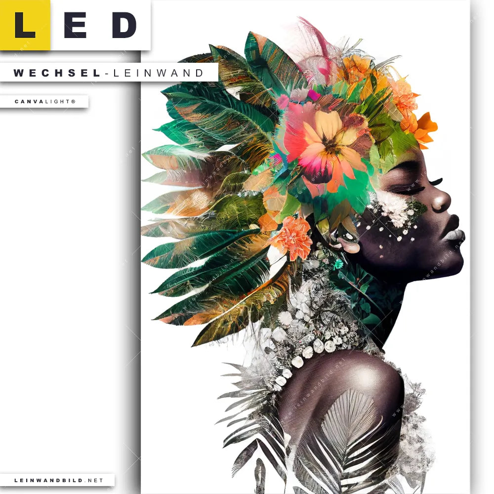 Du bist auf der Suche nach einer Porträts - Menschen, Blumen - Botanik Wechsel-Leinwand für Dein LED-Leinwandbild im Hochformat? Begriffe wie Menschen & Blumen, Frau, Porträt, Beauty, Gesicht, Blumen, Blüten, Blätter, Afrika haben Dich auf der Suche nach Deiner Ersatz-Leinwand für dein LED Wandbild mit wechselbarer Leinwand inspiriert? Farben wie Weiss, Braun, Grün, Orange dürfen auf Deinem neuen Wechselmotiv für Dein XXL Leinwand-LED-Bild nicht fehlen und Leinwände im Modern Art, Floral, Mixed Media Stil für Leuchtbilder passen perfekt zu Deinem Einrichtungsstil?