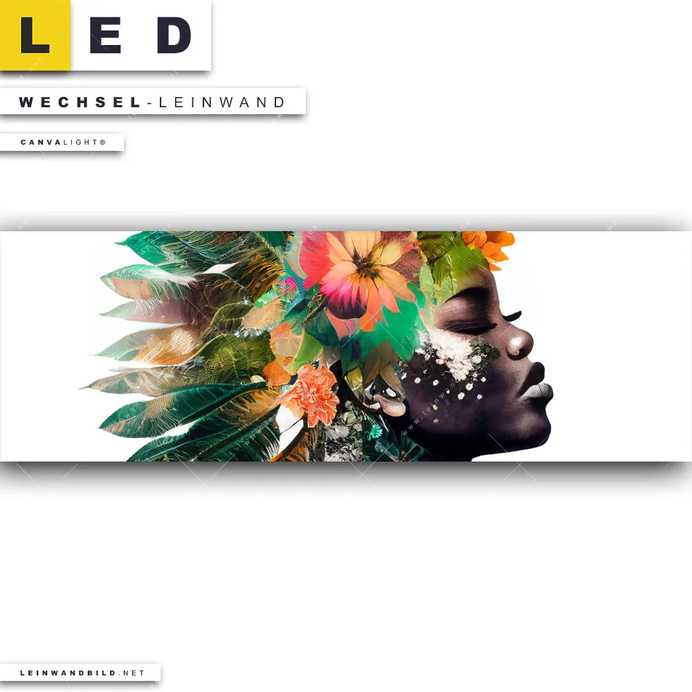 Dann sollte die Wechsel-Leinwand Canvalight® TEX | Doppelbelichtung Porträt einer afrikanischen Frau | Panorama den Weg zu Dir finden. Die Austausch-Leinwand florales Porträt einer Frau - passend für unsere stufenlos dimmbaren, steckerfertigen Leinwandbilder im LED Leuchtrahmen mit Fernbedienung und optionaler Farbtemperatursteuerung - fügt sich als Eye-Catcher harmonisch in jedes Bar - Gastronomie, Friseur - Beauty, Wohnzimmer - Schlafzimmer, Arzt - Praxis, Büro - Kanzlei, Flur - Eingangsbereich Raumkonzept ein.