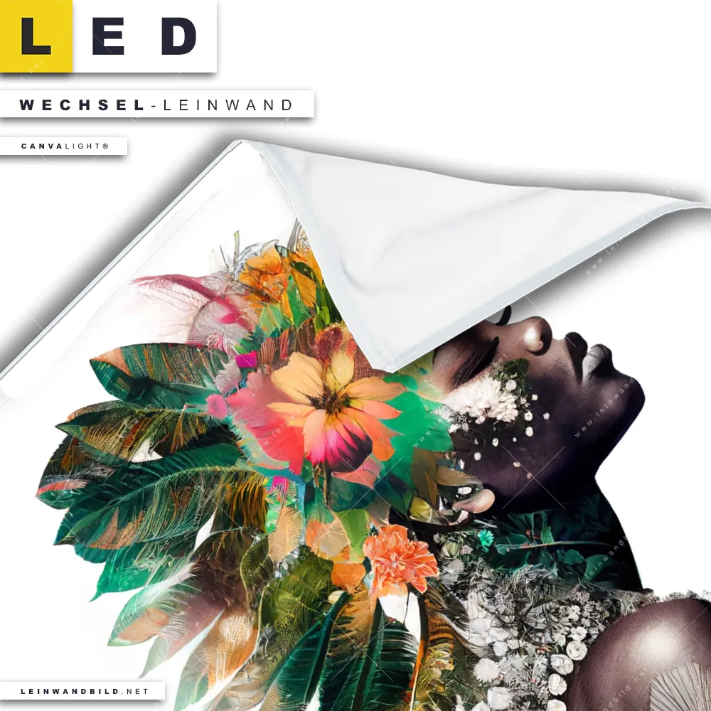 Dann sollte die Wechsel-Leinwand Canvalight® TEX | Doppelbelichtung Porträt einer afrikanischen Frau | Quadrat den Weg zu Dir finden. Die Austausch-Leinwand Frau in Blütenpracht - passend für unsere stufenlos dimmbaren, steckerfertigen Leinwandbilder im Leuchtrahmen mit Fernbedienung und optionaler Farbtemperatursteuerung - fügt sich als Eye-Catcher harmonisch in jedes Bar - Gastronomie, Friseur - Beauty, Wohnzimmer - Schlafzimmer, Arzt - Praxis, Büro - Kanzlei, Flur - Eingangsbereich Raumkonzept ein.
