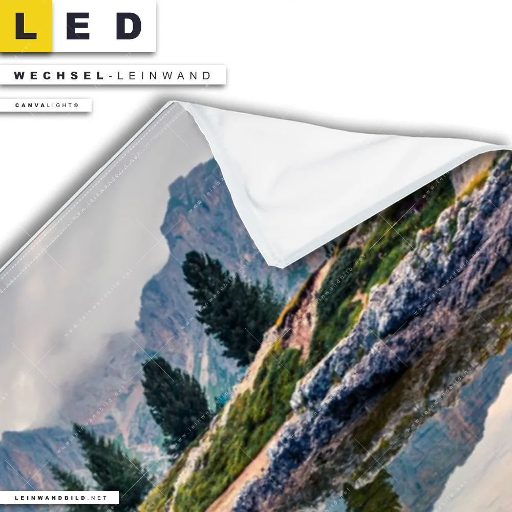 Du bist auf der Suche nach einer Landschaften Wechsel-Leinwand für Dein LED-Leinwandbild im Panorama-Format? Begriffe wie Berge, Bergsee, See, Wasserspiegelung, Gebirge, Dolomiten, Italien, Wanderwege, wandern, Wasser, Natur haben Dich auf der Suche nach Deiner Ersatz-Leinwand für dein extra breites LED Wandbild mit wechselbarer Leinwand inspiriert? Farben wie Grün, Braun, Blau, Hellblau dürfen auf Deinem neuen Wechselmotiv für Dein XXL Leinwand-LED-Bild nicht fehlen und Leinwände im Natürlich - Realistisch Stil für Leuchtbilder passen perfekt zu Deinem Einrichtungsstil?