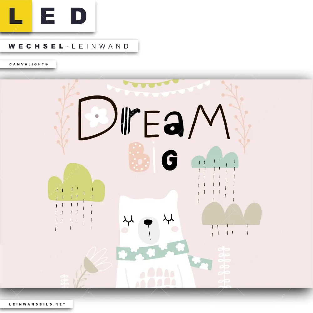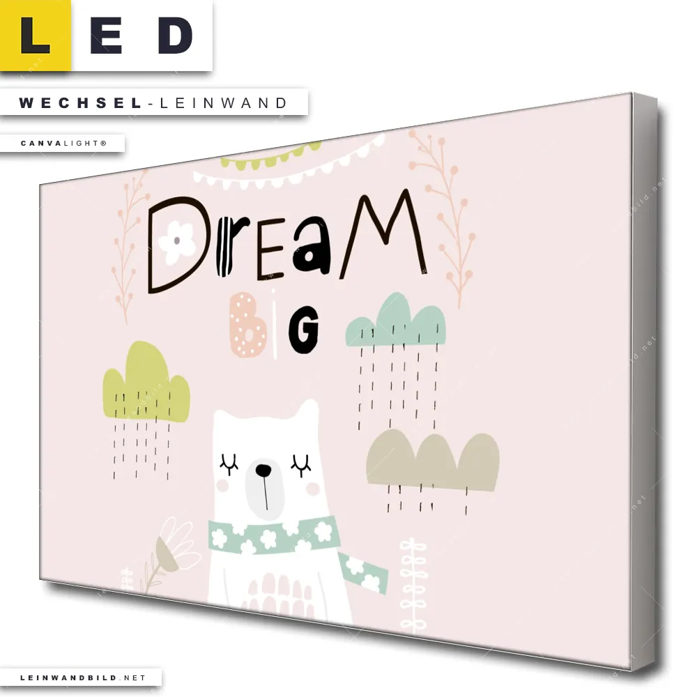Dann sollte die Wechsel-Leinwand Canvalight® TEX | Dream Big Eisbär | Querformat den Weg zu Dir finden. Die Austausch-Leinwand große Träume Eisbär - passend für unsere stufenlos dimmbaren, steckerfertigen Leinwandbilder im Leuchtrahmen mit Fernbedienung und optionaler Farbtemperatursteuerung - fügt sich als Eye-Catcher harmonisch in jedes Kinderzimmer, Arzt - Praxis, Friseur - Beauty Raumkonzept ein.