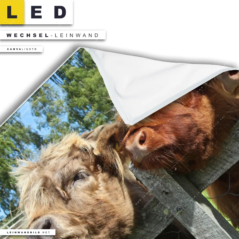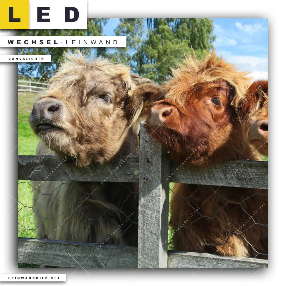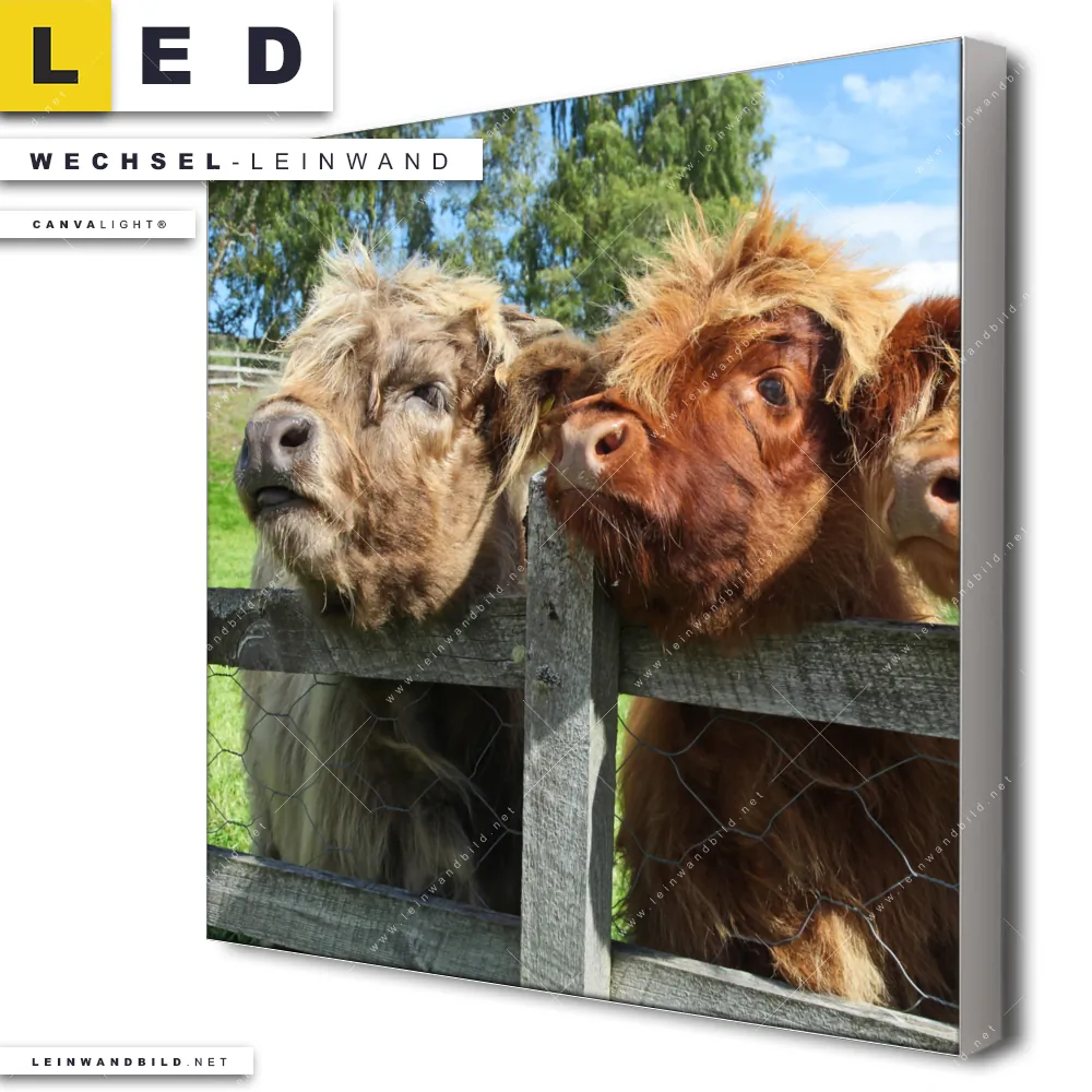 Du konfigurierst Deine individuelle LED Wechsel-Leinwand Canvalight® TEX | Drei Schottische Rinder | Quadrat und wir produzieren sie NEU für Dich. Unsere Tierwelt Austausch-Fotoleinwände für Canvalight® LED Bilder sind KEINE Lagerware. Du bist Dir unsicher, welches Motiv oder Format das richtige für dein individuelles LED Wechselmotiv auf Leinwand ist, dann helfen wir dir gerne weiter und beraten dich!